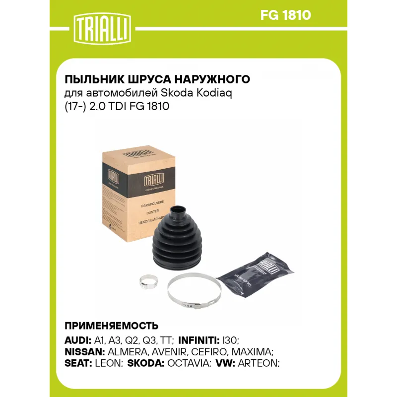 Пыльник ШРУСа наружного для автомобилей Skoda Kodiaq (17-) 2.0 TDI Характеристики: Артикул: FG 1810 OEM номера: 39241-5V125, 39241-5V100, 39241-5V127, 3741452110K0, 1K0407285P, 1K0498203C Сторона установки: со стороны колеса, передняя ось Количество на автомобиль: 2 Высота, мм: 114.6 Гарантийный срок: 1 год/30 000 км Наружный диаметр ШРУСа, мм: 95.5 Посадочный диаметр вала, мм: 27 Материал: TPEE (термопласт) Товарная линейка: BLACK Комплектация: Чехол ШРУСа - 1 шт Хомут - 2 шт Смазка - 1 туба Гарантия: от 1 года.