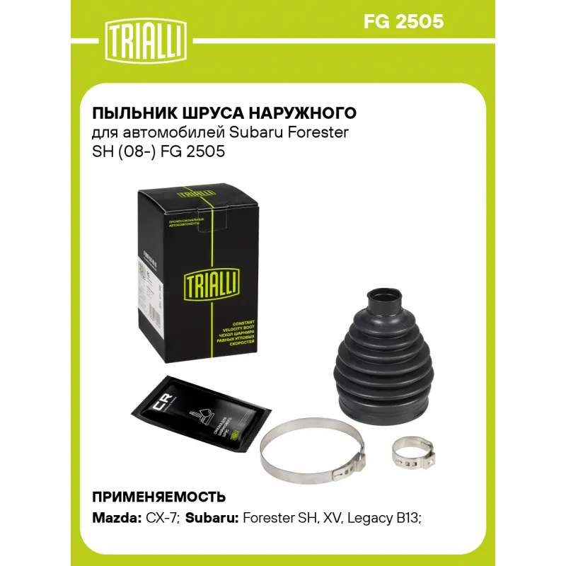 Пыльник ШРУСа наружного для автомобилей Subaru Forester SH (08-) Характеристики: Артикул: FG 2505 OEM номера: GD68-22-530, GD71-25-50XB, GD71-25-60XB, MN156753, MR953956, 7701209465, 32006328, 28323-AG000, 28323-AG020, 28396-AG00A, 28396-AG00B Сторона установки: со стороны колеса, передняя ось Количество на автомобиль: 2 Высота, мм: 100 Гарантийный срок: 1 год/30 000 км Наружный диаметр ШРУСа, мм: 72.5 Посадочный диаметр вала, мм: 23.7 Материал: TPEE (термопласт) Товарная линейка: BLACK Подходит для авто: Mazda CX-7 (07-) Subaru Forester SH (08-), XV (11-), Legacy B13 (03-) Для проверки применяемости отправьте VIN автомобиля через вкладку "Есть вопросы о товаре?" Комплектация: Чехол ШРУСа - 1 шт Хомут - 2 шт Смазка - 1 туба Гарантия: от 1 года.