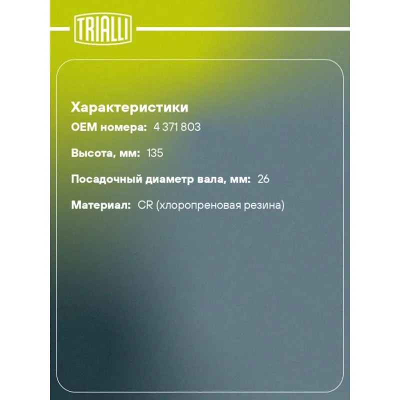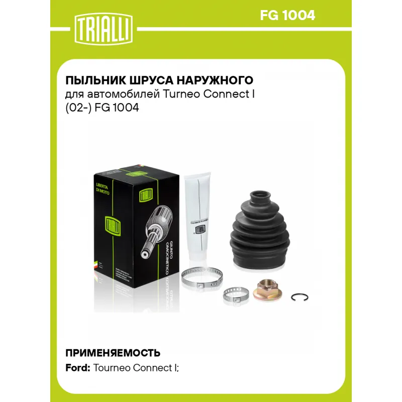 Пыльник ШРУСа наружного для автомобилей Turneo Connect I (02-) Характеристики: Артикул: FG 1004 OEM номера: 4 371 803 Сторона установки: со стороны колеса, передняя ось Количество на автомобиль: 2 Сопутствующие товары:: GO 1016 Высота, мм: 135 Гарантийный срок: 1 год/30 000 км Наружный диаметр ШРУСа, мм: 84,5 Посадочный диаметр вала, мм: 26 Сопутствующий товар: Приводы: AR 1006, AR 1005 Сопутствующий товар: ШРУСы: GO 1016 Материал: CR (хлоропреновая резина) Товарная линейка: BLACK Подходит для авто: Ford Tourneo Connect I (02-) Для проверки применяемости отправьте VIN автомобиля через вкладку "Есть вопросы о товаре?" Комплектация: Чехол ШРУСа - 1 шт Стопорное кольцо - 1 шт Хомут - 2 шт Гайка - 1 шт Тюбик со смазкой - 1 шт Гарантия: от 1 года.