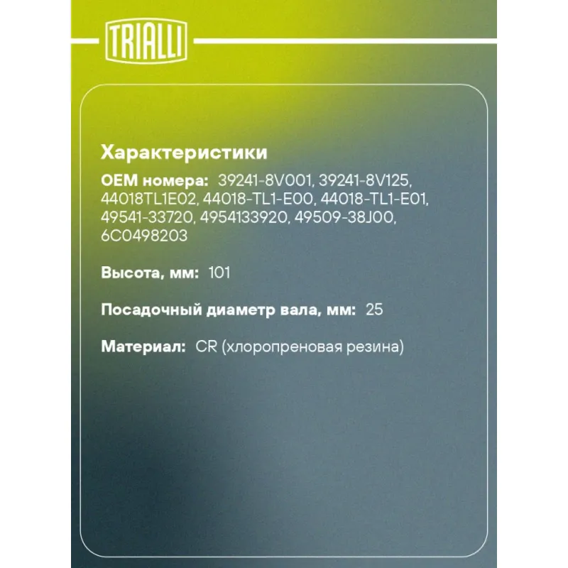 Пыльник ШРУСа наружного для автомобилей Volkswagen Polo V (09-) Характеристики: Артикул: FG 1414 OEM номера: 39241-8V001, 39241-8V125, 44018TL1E02, 44018-TL1-E00, 44018-TL1-E01, 49541-33720, 4954133920, 49509-38J00, 6C0498203 Сторона установки: со стороны колеса, передняя ось Количество на автомобиль: 2 Высота, мм: 101 Гарантийный срок: 1 год/30 000 км Наружный диаметр ШРУСа, мм: 87,5 Посадочный диаметр вала, мм: 25 Материал: CR (хлоропреновая резина) Товарная линейка: BLACK Подходит для авто: Volkswagen Polo V (09-), Polo V (09-) Nissan Almera N16 (00-), Primera P12 (02-) Для проверки применяемости отправьте VIN автомобиля через вкладку "Есть вопросы о товаре?" Комплектация: Чехол ШРУС - 1 шт Хомут - 2 шт Смазка - 1 туба Гарантия: от 1 года.