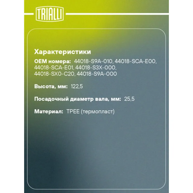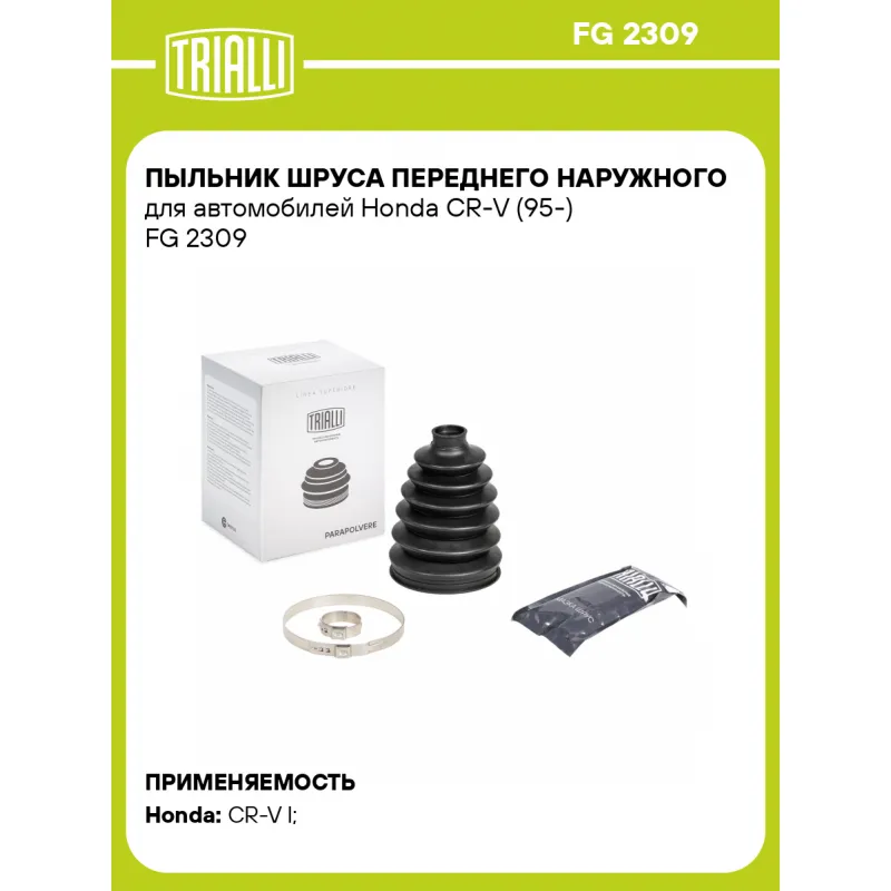 Пыльник ШРУСа переднего наружного для автомобилей Honda CR-V (95-) Характеристики: Артикул: FG 2309 OEM номера: 44018-S9A-010, 44018-SCA-E00, 44018-SCA-E01, 44018-S3X-000, 44018-SX0-C20, 44018-S9A-000 Сторона установки: со стороны колеса, передняя ось Количество на автомобиль: 2 Высота, мм: 122.5 Гарантийный срок: 1 год/30 000 км Наружный диаметр ШРУСа, мм: 90.5 Посадочный диаметр вала, мм: 25.5 Материал: TPEE (термопласт) Товарная линейка: BLACK Подходит для авто: Honda CR-V I (95-) Для проверки применяемости отправьте VIN автомобиля через вкладку "Есть вопросы о товаре?" Комплектация: Чехол ШРУСа - 1 шт Хомут - 2 шт Смазка - 1 туба Гарантия: от 1 года.