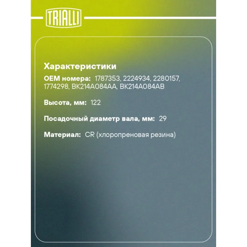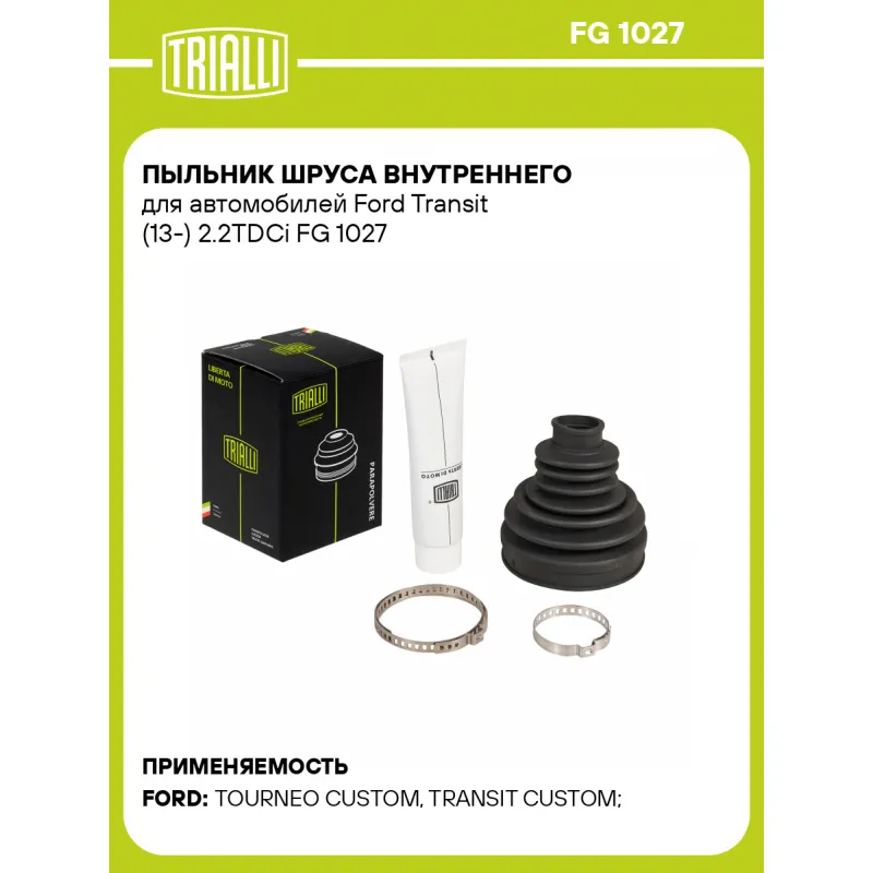 Пыльник ШРУСа внутреннего для автомобилей Ford Transit (13-) 2.2TDCi Характеристики: Артикул: FG 1027 OEM номера: 1787353, 2224934, 2280157, 1774298, BK214A084AA, BK214A084AB Гарантийный срок: 1 год/30 000 км Сторона установки: со стороны КПП, передняя ось Количество на автомобиль: 2 Высота, мм: 122 Наружный диаметр ШРУСа, мм: 95.5 Посадочный диаметр вала, мм: 29 Материал: CR (хлоропреновая резина) Товарная линейка: BLACK Комплектация: Чехол ШРУСа - 1 шт Хомут - 2 шт Тюбик со смазкой - 1 шт Гарантийный талон - 1 шт Гарантия: от 1 года.