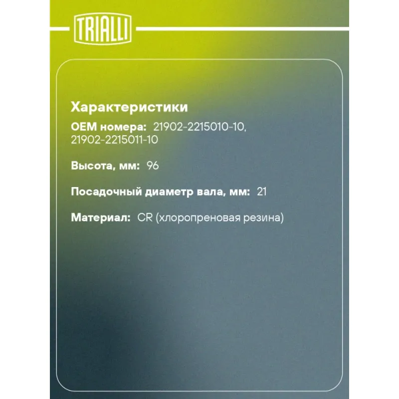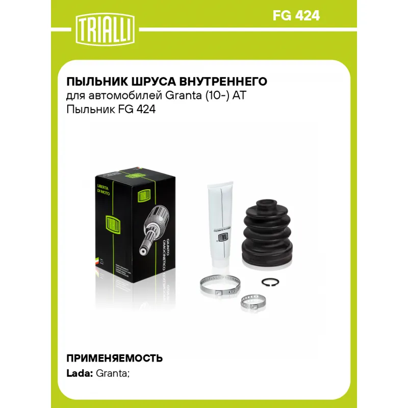 Пыльник ШРУСа внутреннего для автомобилей Granta (10-) AT Пыльник Характеристики: Артикул: FG 424 OEM номера: 21902-2215010-10, 21902-2215011-10 Сторона установки: со стороны КПП, передняя ось Количество на автомобиль: 2 Сопутствующие товары:: GO 424, AR 830, AR 831 Высота, мм: 96 Гарантийный срок: 1 год/30 000 км Наружный диаметр ШРУСа, мм: 72 Посадочный диаметр вала, мм: 21 Материал: CR (хлоропреновая резина) Товарная линейка: BLACK КПП: АКПП Jatco (Nissan) JF414E Подходит для авто: ВАЗ Granta (10-) Для проверки применяемости отправьте VIN автомобиля через вкладку "Есть вопросы о товаре?" Комплектация: Чехол ШРУСа - 1 шт Стопорное кольцо - 1 шт Хомут - 2 шт Тюбик со смазкой - 1 шт Гарантия: от 1 года.