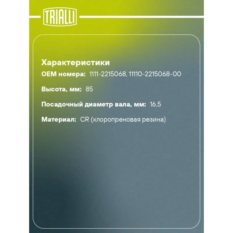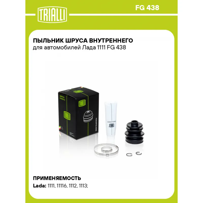Пыльник ШРУСа внутреннего для автомобилей Лада 1111 Характеристики: Артикул: FG 438 OEM номера: 1111-2215068, 11110-2215068-00 Сторона установки: со стороны КПП, передняя ось Количество на автомобиль: 2 Высота, мм: 85 Гарантийный срок: 1 год/30 000 км Наружный диаметр ШРУСа, мм: 63 Посадочный диаметр вала, мм: 16.5 Материал: CR (хлоропреновая резина) Товарная линейка: BLACK Подходит для авто: ВАЗ 1111 (Ока), 11116, 1112, 1113 Для проверки применяемости отправьте VIN автомобиля через вкладку "Есть вопросы о товаре?" Комплектация: Чехол ШРУСа - 1 шт Стопорное кольцо - 2 шт Хомут - 2 шт Тюбик со смазкой - 1 шт Гарантийный талон - 1 шт Гарантия: от 1 года.