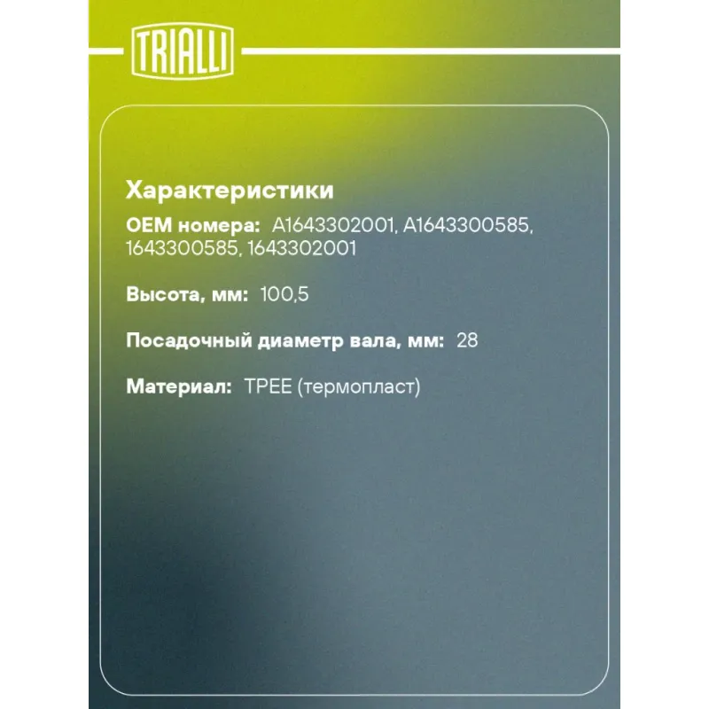 Пыльник ШРУСа внутреннего для автомобилей Mercedes-Benz M-klasse II (W164) (05-) Характеристики: Артикул: FG 1511 OEM номера: A1643302001, A1643300585, 1643300585, 1643302001 Сторона установки: со стороны КПП, передняя ось Количество на автомобиль: 2 Высота, мм: 100.5 Гарантийный срок: 1 год/30 000 км Наружный диаметр ШРУСа, мм: 90 Посадочный диаметр вала, мм: 28 Материал: TPEE (термопласт) Товарная линейка: BLACK Подходит для авто: Mercedes-Benz M-Class II (W164) (05-) Для проверки применяемости отправьте VIN автомобиля через вкладку "Есть вопросы о товаре?" Комплектация: Чехол ШРУСа - 1 шт Хомут - 2 шт Смазка - 1 туба Гарантия: от 1 года.