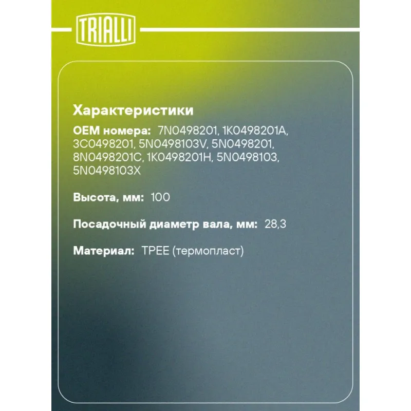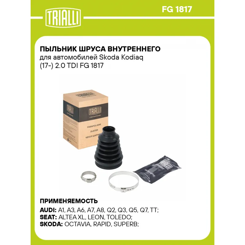Пыльник ШРУСа внутреннего для автомобилей Skoda Kodiaq (17-) 2.0 TDI Характеристики: Артикул: FG 1817 OEM номера: 7N0498201, 1K0498201A, 3C0498201, 5N0498103V, 5N0498201, 8N0498201C, 1K0498201H, 5N0498103, 5N0498103X Сторона установки: со стороны КПП, передняя ось Количество на автомобиль: 2 Высота, мм: 100 Гарантийный срок: 1 год/30 000 км Наружный диаметр ШРУСа, мм: 66.5 Посадочный диаметр вала, мм: 28.3 Материал: TPEE (термопласт) Товарная линейка: BLACK Комплектация: Чехол ШРУСа - 1 шт Хомут - 2 шт Смазка - 1 туба Гарантия: от 1 года.