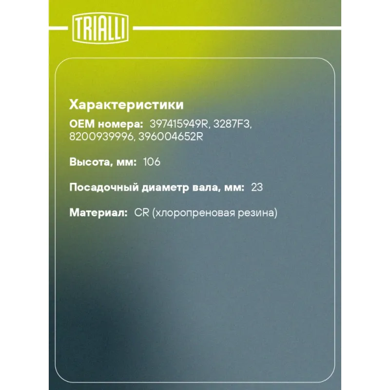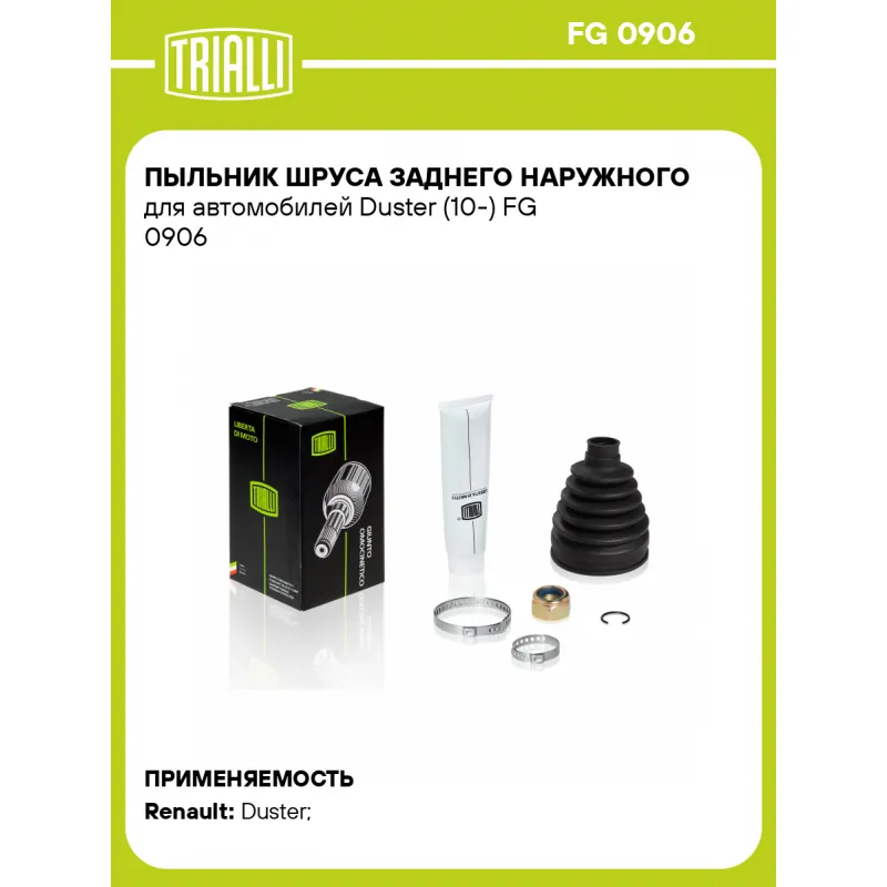 Пыльник ШРУСа заднего наружного для автомобилей Duster (10-) Характеристики: Артикул: FG 0906 OEM номера: 397415949R, 3287F3, 8200939996, 396004652R Сторона установки: со стороны колеса, задняя ось Количество на автомобиль: 2 Сопутствующие товары:: GO 0906, AR 0911 Высота, мм: 106 Гарантийный срок: 1 год/30 000 км Наружный диаметр ШРУСа, мм: 73 Посадочный диаметр вала, мм: 23 Сопутствующий товар: Приводы: AR 0911 Сопутствующий товар: ШРУСы: GO 0906 Материал: CR (хлоропреновая резина) Товарная линейка: BLACK Подходит для авто: Renault Duster (10-) Для проверки применяемости отправьте VIN автомобиля через вкладку "Есть вопросы о товаре?" Комплектация: Чехол ШРУСа - 1 шт Стопорное кольцо - 1 шт Хомут - 2 шт Гайка - 1 шт Тюбик со смазкой - 1 шт Гарантийный талон - 1 шт Гарантия: от 1 года.