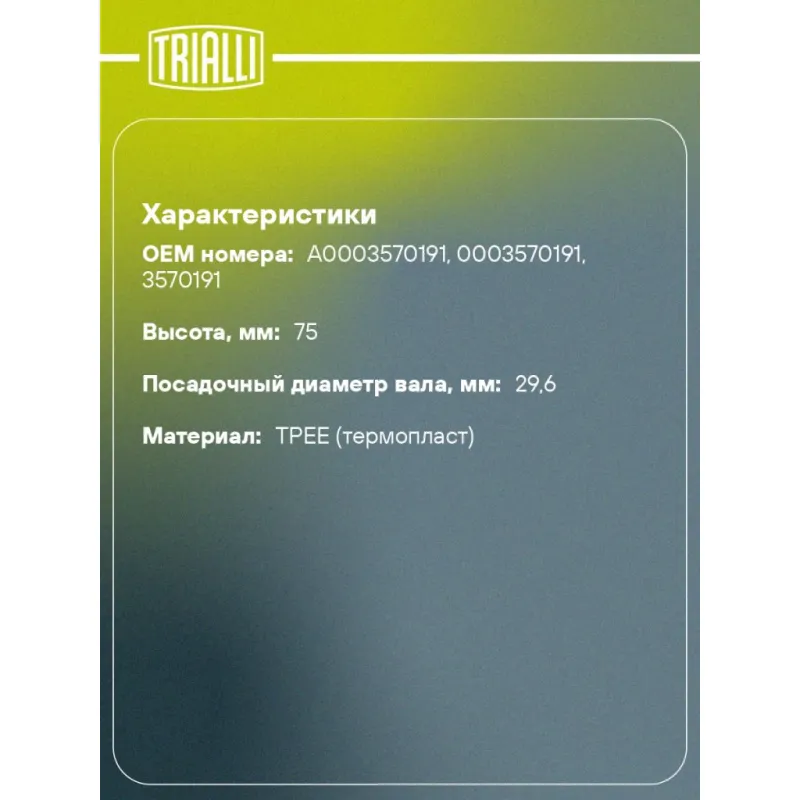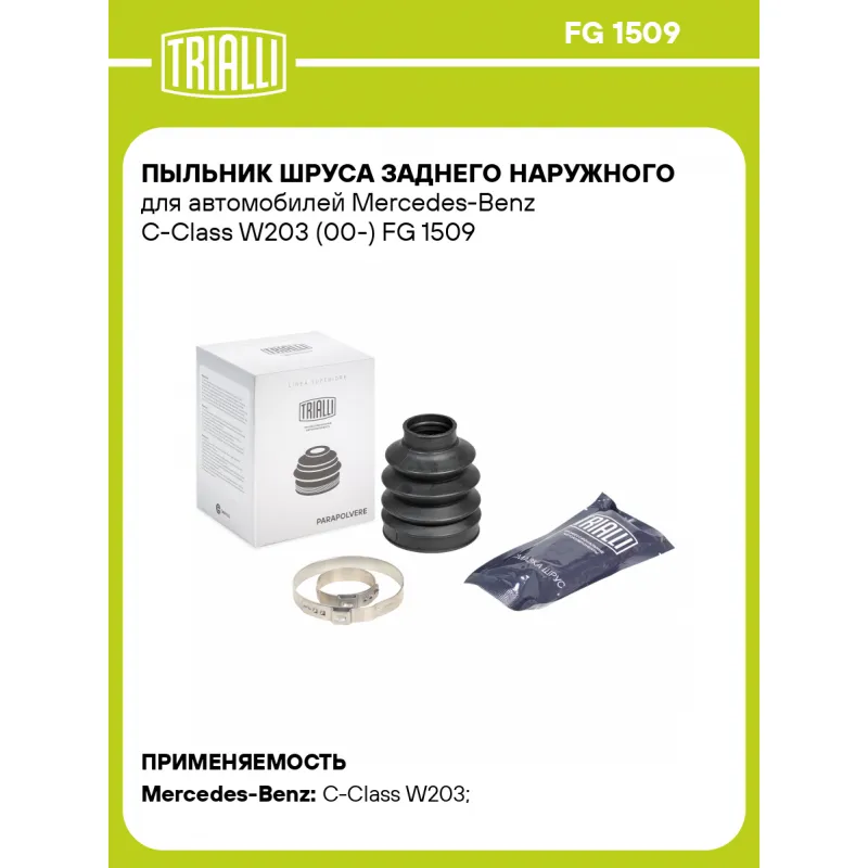 Пыльник ШРУСа заднего наружного для автомобилей Mercedes-Benz C-Class W203 (00-) Характеристики: Артикул: FG 1509 OEM номера: A0003570191, 0003570191, 3570191 Сторона установки: со стороны колеса, задняя ось Количество на автомобиль: 2 Высота, мм: 75 Гарантийный срок: 1 год/30 000 км Наружный диаметр ШРУСа, мм: 63.7 Посадочный диаметр вала, мм: 29.6 Материал: TPEE (термопласт) Товарная линейка: BLACK Подходит для авто: Mercedes-Benz C-Class W203 (00-) Для проверки применяемости отправьте VIN автомобиля через вкладку "Есть вопросы о товаре?" Комплектация: Чехол ШРУСа - 1 шт Хомут - 2 шт Смазка - 1 туба Гарантия: от 1 года.