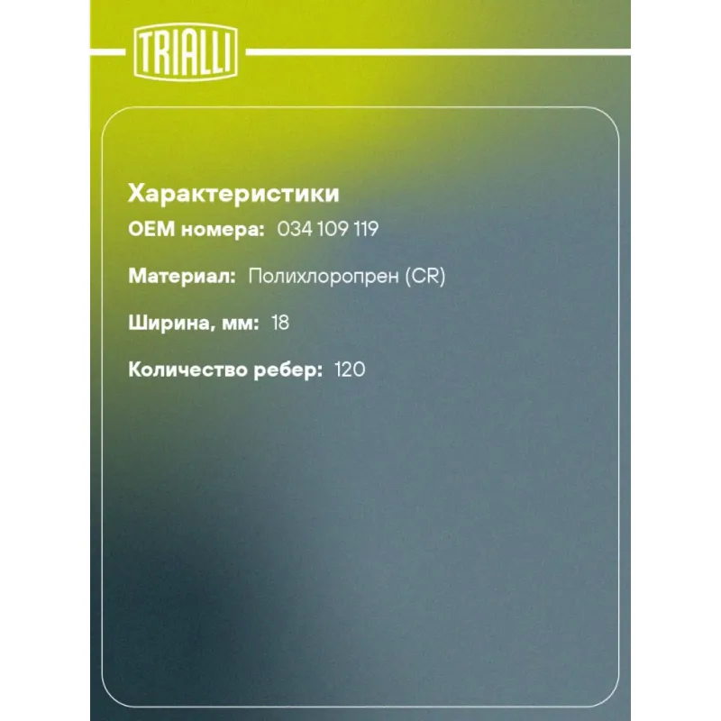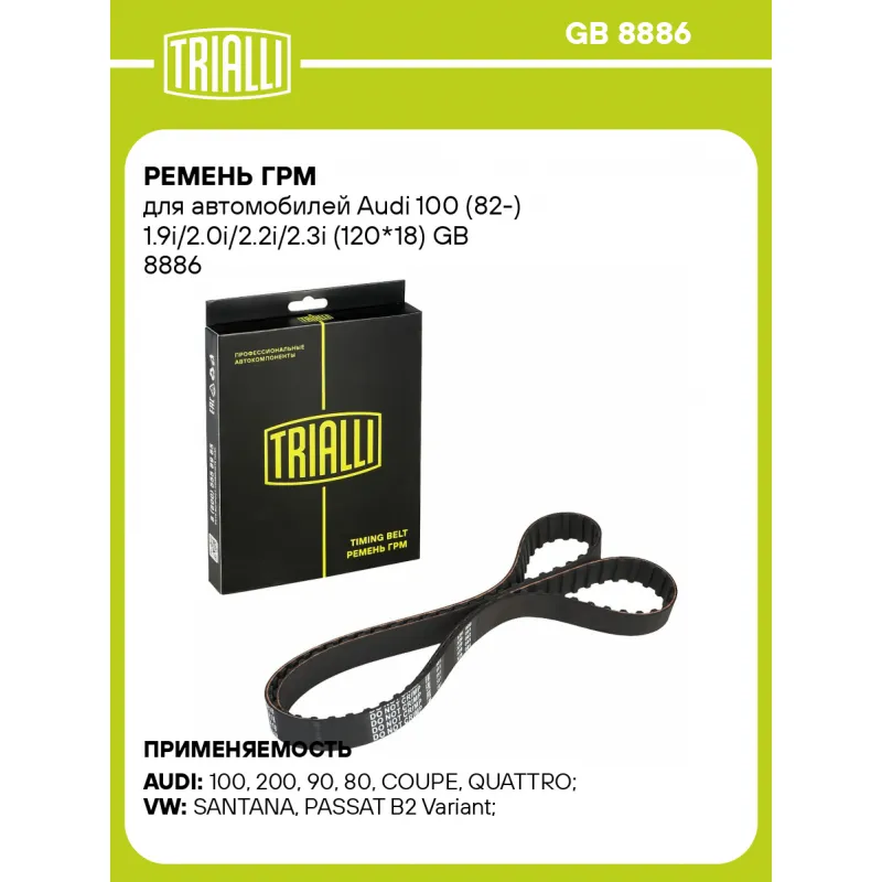 Ремень ГРМ для автомобилей Audi 100 (82-) 1.9i/2.0i/2.2i/2.3i (120*18) Характеристики: Артикул: GB 8886 OEM номера: 034 109 119 Материал: Полихлоропрен (CR) Особенности конструкции:: 120ZA18 Ширина, мм: 18 Количество ребер: 120 Длина, мм.: 1143 Гарантийный срок: 2 года/60 000 км. Товарная линейка: BLACK Количество на автомобиль:... Читать полностью →