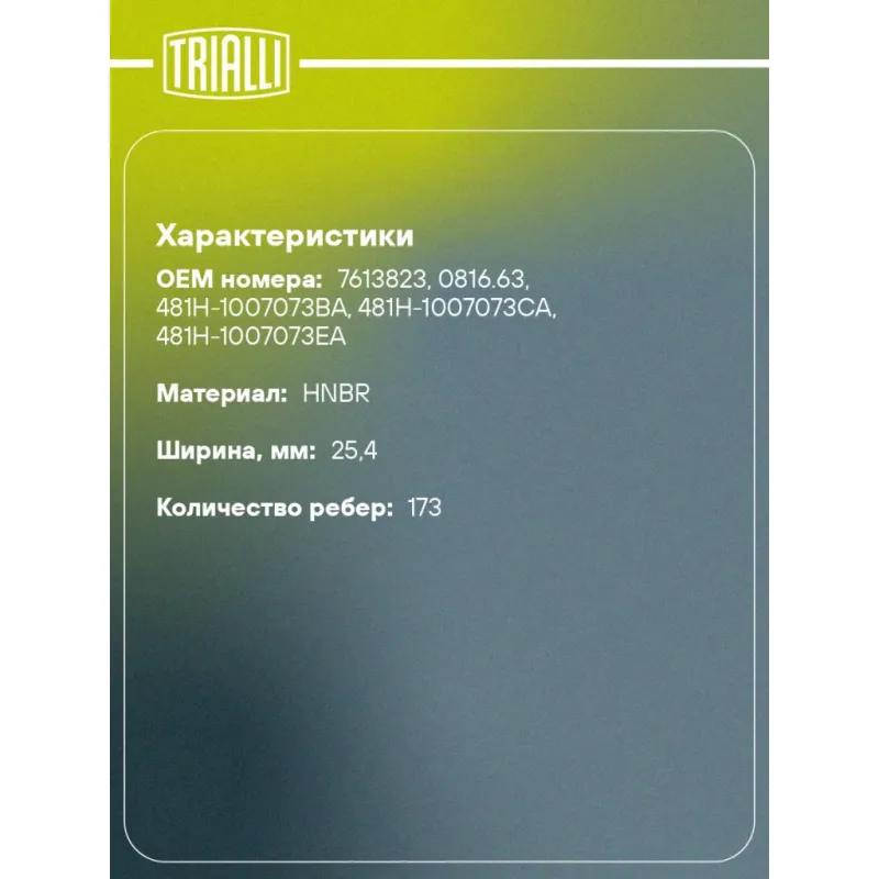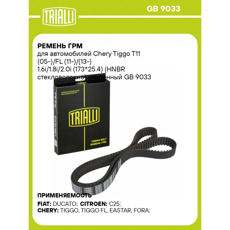 Ремень ГРМ для автомобилей Chery Tiggo T11 (05-)/FL (11-)/(13-) 1.6i/1.8i/2.0i (173*25.4) (HNBR стекловолокно) усиленный Характеристики: Артикул: GB 9033 OEM номера: 7613823, 0816.63, 481H-1007073BA, 481H-1007073CA, 481H-1007073EA Материал: HNBR Особенности конструкции:: 173SHPN25.4 Ширина, мм: 25,4 Количество ребер: 173 Длина, ... Читать полностью →
