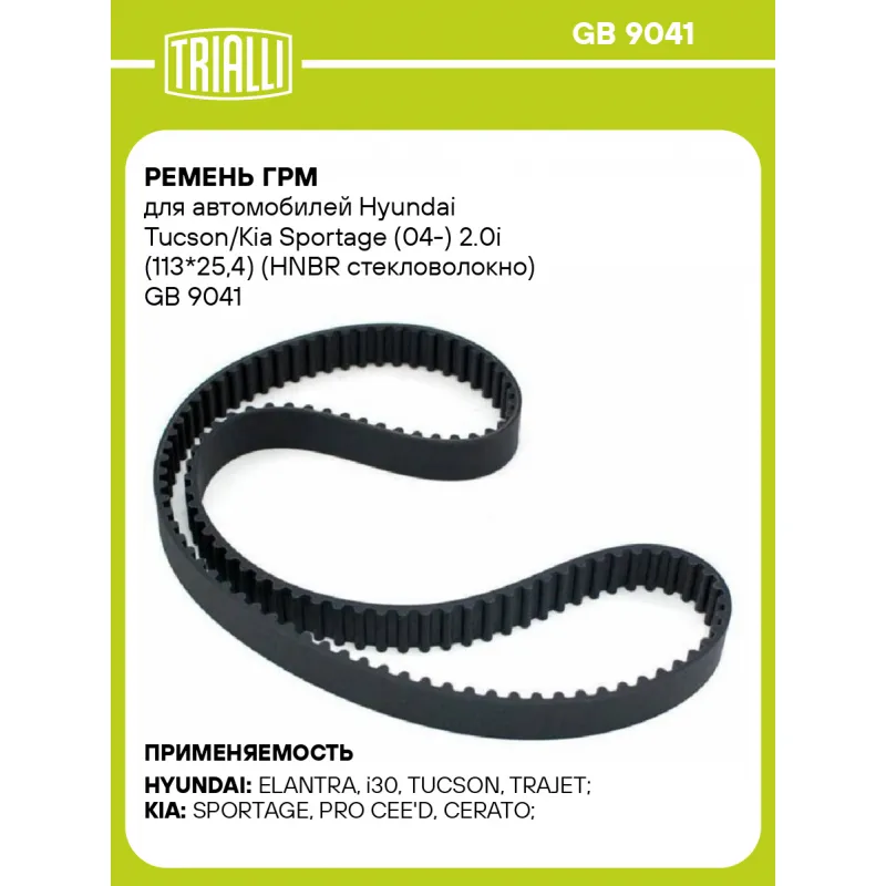 Ремень ГРМ для автомобилей Hyundai Tucson/Kia Sportage (04-) 2.0i (113*25,4) (HNBR стекловолокно) Характеристики: Артикул: GB 9041 OEM номера: 2431223400, 2431223202, 2431223201 Материал: HNBR Особенности конструкции:: 113RU25.4 Ширина, мм: 25.4 Количество ребер: 113 Длина, мм.: 1076 Гарантийный срок: 2 года/60 000 км. Сопутствующие товары: Ролики: CM 0831, CM 0806 Количество на автомобиль: 1 Товарная линейка: BLACK Комплектация: Ремень ГРМ - 1 шт Гарантия: от 1 года.