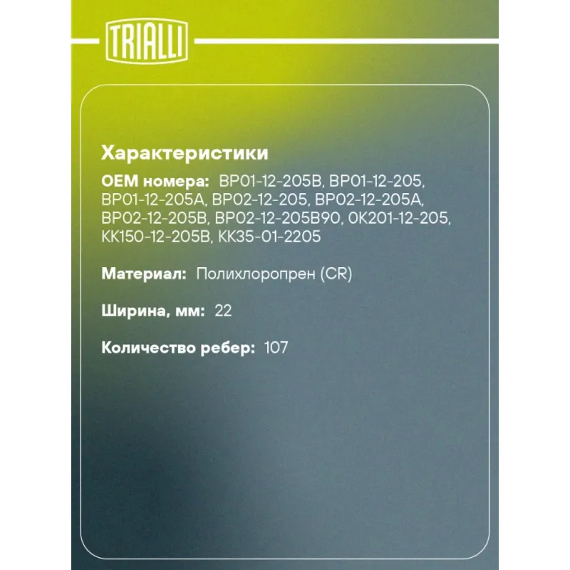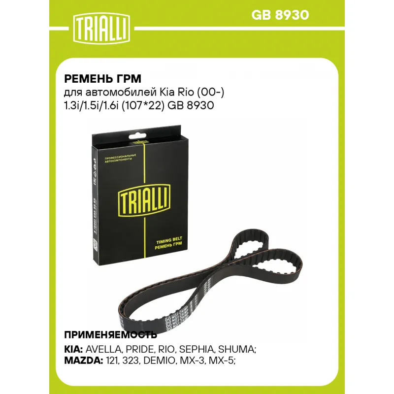 Ремень ГРМ для автомобилей Kia Rio (00-) 1.3i/1.5i/1.6i (107*22) Характеристики: Артикул: GB 8930 OEM номера: BP01-12-205B, BP01-12-205, BP01-12-205A, BP02-12-205, BP02-12-205A, BP02-12-205B, BP02-12-205B90, 0K201-12-205, KK150-12-205B, KK35-01-2205, MBP01-12-205B Материал: Полихлоропрен (CR) Сопутствующие товары:: GD 0995 Особенности конструкции:: 107YU22 Ширина, мм: 22 Количество ребер: 107 Длина, мм.: 856 Гарантийный срок: 2 года/60 000 км. Сопутствующие товары: Ролики: CM 6066 Количество на автомобиль: 1 Товарная линейка: BLACK Комплектация: Ремень ГРМ - 1 шт Гарантия: от 1 года.