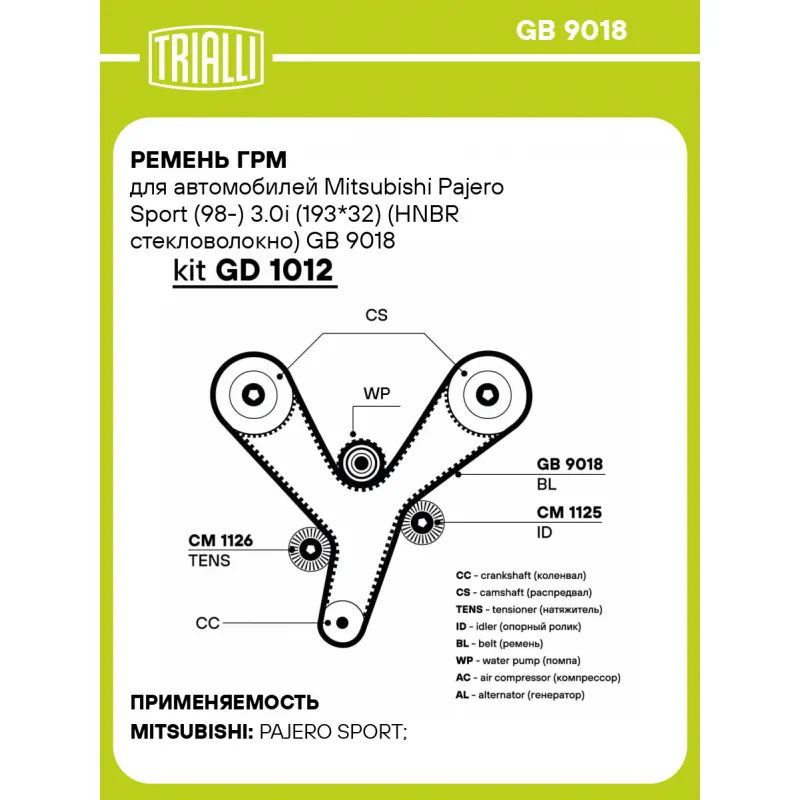 Ремень ГРМ для автомобилей Mitsubishi Pajero Sport (98-) 3.0i (193*32) (HNBR стекловолокно) Характеристики: Артикул: GB 9018 OEM номера: MD358557, MD376561 Материал: HNBR Особенности конструкции:: 193YU32 Ширина, мм: 32 Количество ребер: 193 Длина, мм.: 1544 Гарантийный срок: 2 года/60 000 км. Товарная линейка: BLACK Количество ... Читать полностью →