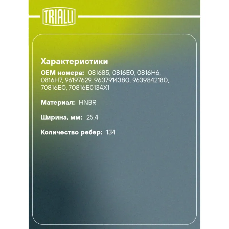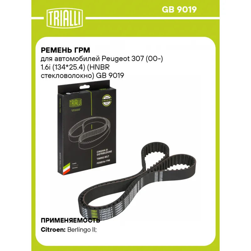 Ремень ГРМ для автомобилей Peugeot 307 (00-) 1.6i (134*25.4) (HNBR стекловолокно) Характеристики: Артикул: GB 9019 OEM номера: 081685, 0816E0, 0816H6, 0816H7, 96197629, 9637914380, 9639842180, 70816E0, 70816E0134X1 Материал: HNBR Особенности конструкции:: 134RU25.4 Ширина, мм: 25,4 Количество ребер: 134 Длина, мм.: 1276 Гарантийный срок: 2 года/60 000 км. Товарная линейка: BLACK Количество на автомобиль: 1 Подходит для авто: Citroen Berlingo II (08-) Для проверки применяемости отправьте VIN автомобиля через вкладку "Есть вопросы о товаре?" Комплектация: Ремень ГРМ - 1 шт Гарантия: от 1 года.