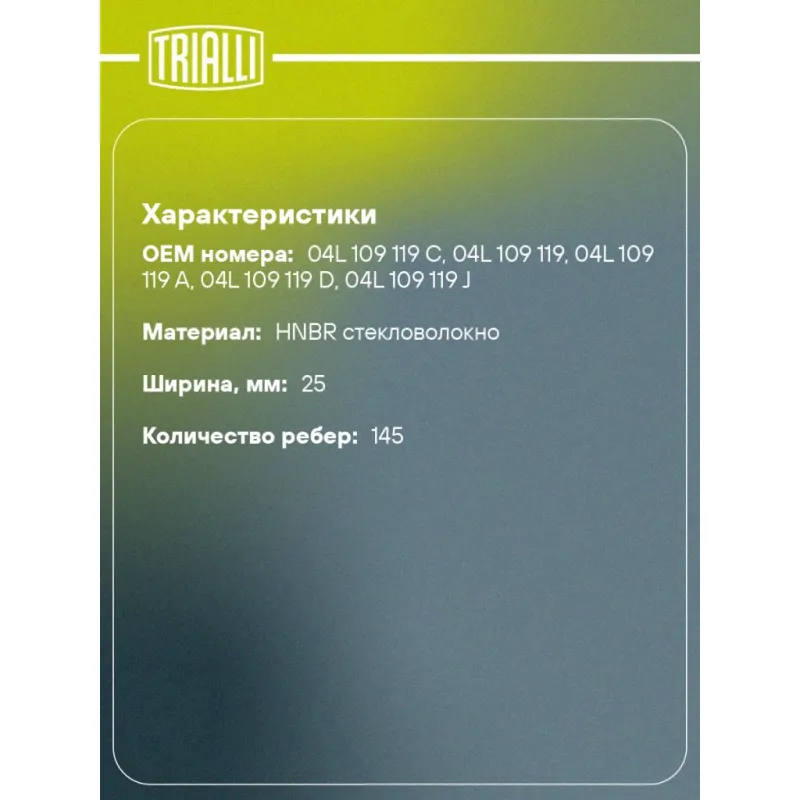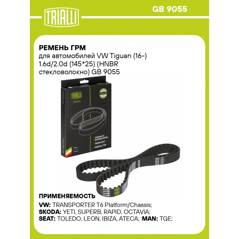 Ремень ГРМ для автомобилей VW Tiguan (16-) 1.6d/2.0d (145*25) (HNBR стекловолокно) Характеристики: Артикул: GB 9055 OEM номера: 04L 109 119 C, 04L 109 119, 04L 109 119 A, 04L 109 119 D, 04L 109 119 J Материал: HNBR стекловолокно Особенности конструкции:: 145RU25 Ширина, мм: 25 Количество ребер: 145 Длина, мм.: 1381 Гарантийный с... Читать полностью →
