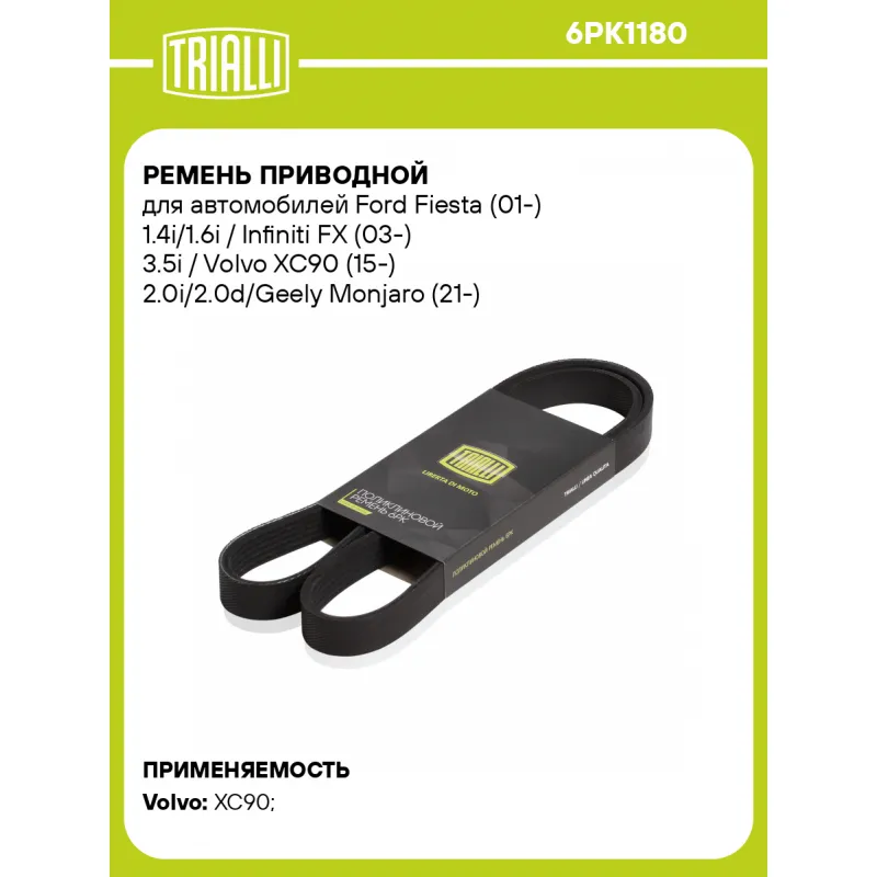 Ремень приводной для автомобилей Ford Fiesta (01-) 1.4i/1.6i / Infiniti FX (03-) 3.5i / Volvo XC90 (15-) 2.0i/2.0d/Geely Monjaro (21-) 2.0i (6PK1180) 6PK1180 TRIALLI