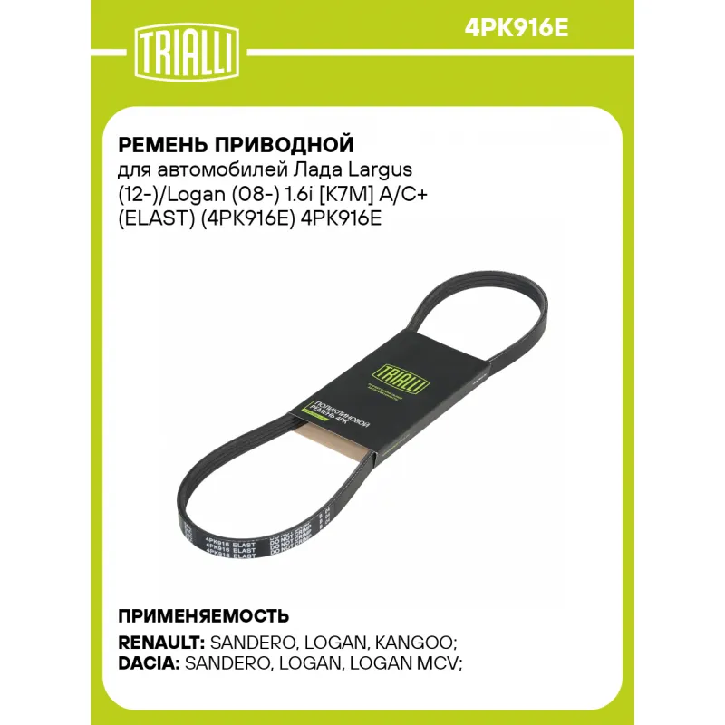 Ремень приводной для автомобилей Лада Largus (12-)/Logan (08-) 1.6i [K7M] A/C+ (ELAST) (4PK916E) Характеристики: Артикул: 4PK916E OEM номера: 7701475913, 6001547970, 8200193083 Материал: EPDM Количество ребер: 4 Длина, мм.: 916 Товарная линейка: BLACK Количество на автомобиль: 1 Ширина, мм: 916 Комплектация: Ремень поликлиновой ELAST - 1 шт Гарантия: от 1 года.