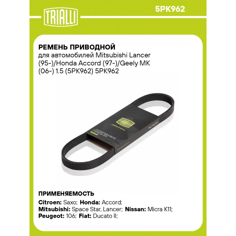 Ремень приводной для автомобилей Mitsubishi Lancer (95-)/Honda Accord (97-)/Geely MK (06-) 1.5 (5PK962) Характеристики: Артикул: 5PK962 OEM номера: 5750K5, 5750.WC, 7644467, 7765717, 71739610, 71749421, 38920PY3505, 38920PY3003, 38920-PY3-A01, 7632090, MD357086, MD363460, 11720-6F900, 5750K4, 96165809, 90916-02682, 9936500960, 99365-20960, E030000401, LF479Q1-1025015A Количество на автомобиль: 1 Длина, мм.: 962 Количество ребер: 5 Материал: EPDM Товарная линейка: BLACK Номера аналоги: 5PK960, 5PK961, 5PK962, 5PK963, 5PK964 Подходит для авто: Citroen Saxo (96-) Honda Accord (97-) Mitsubishi Space Star (01-), Lancer (96-) Nissan Micra K11 (92-) Peugeot 106 (96-) Fiat Ducato II (94-) Для проверки применяемости отправьте VIN автомобиля через вкладку "Есть вопросы о товаре?" Комплектация: Ремень поликлиновой - 1 шт Гарантия: от 1 года.
