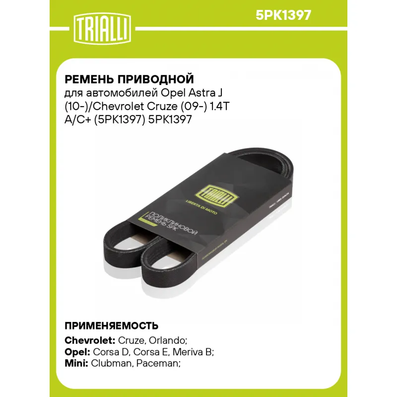 Ремень приводной для автомобилей Opel Astra J (10-)/Chevrolet Cruze (09-) 1.4T A/C+ (5PK1397) Характеристики: Артикул: 5PK1397 OEM номера: 1340018, 1340053, 55578811, 55583125, 11288511919, 11288573417, 55578116, 55578816, T11-3701315 Количество на автомобиль: 1 Длина, мм.: 1397 Количество ребер: 5 Материал: EPDM Товарная линейка: BLACK Номера аналоги: 5PK1395, 5PK1396, 5PK1397, 5PK1398, 5PK1399 Подходит для авто: Chevrolet Cruze (09-), Orlando (10-) Opel Corsa D (06-), Corsa E (14-), Meriva B (10-), Zafira C (11-), Astra J (10-) Mini Clubman (07-), Paceman (12-) Для проверки применяемости отправьте VIN автомобиля через вкладку "Есть вопросы о товаре?" Комплектация: Ремень поликлиновой - 1 шт Гарантия: от 1 года.