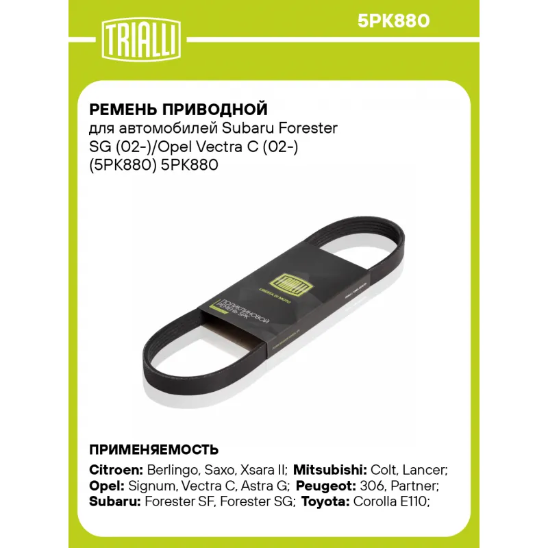 Ремень приводной для автомобилей Subaru Forester SG (02-)/Opel Vectra C (02-) (5PK880) Характеристики: Артикул: 5PK880 OEM номера: 60597250, 5750Q7, 5750.SE, 96129662, 96155377, 31110PK2003, 31110PK2004, MB813806, 55351459, 1340661, 6340610, 1340668, 1340669, 1340675, 1340678, 12634322, 1340014, 6340644, 400799, 7701064349, 7700872533, 7700868273, 809218230, 809218270, 809218290, 809218300, 809218390, 809218430, 809218150, 809218160, 809218170, 809218750, 809218250, 809218210, 809218310, 809218380, 809218130, 809218140, 9091602186, 90916-02297, 90916-02338, 9185008804, 9936500880, 9936520880, 9936550880, 9936570880, 93182248, 91132011, 9195192, 9201688, 9201723, 24435953, 24466976 Количество на автомобиль: 1 Длина, мм.: 880 Количество ребер: 5 Материал: EPDM Товарная линейка: BLACK Номера аналоги: 5PK878, 5PK879, 5PK880, 5PK881, 5PK882 Подходит для авто: Citroen Berlingo (00-), Saxo (96-), Xsara II (00-) Mitsubishi Colt (92-), Lancer (91-) Opel Signum (02-), Vectra C (02-), Astra G (98-), Vectra B (95-), Zafira A (99-), Zafira B (05-) Peugeot 306 (97-), 306 (97-), Partner (96-) Subaru Forester SF (97-), Forester SG (02-), Impreza G10 (92-), Impreza G11 (00-), Impreza G12 (08-), Legacy B10 (89-), Legacy B11 (94-), Legacy B12 (98-), Legacy B13 (03-), Outback B12 (98-), Outback B13 (03-) Toyota Corolla E110 (95-) Honda Prelude (83-) Для проверки применяемости отправьте VIN автомобиля через вкладку "Есть вопросы о товаре?" Комплектация: Ремень поликлиновой - 1 шт Гарантия: от 1 года.