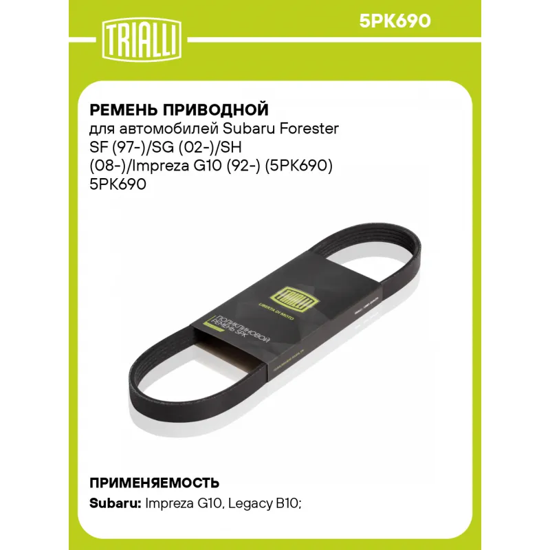 Ремень приводной для автомобилей Subaru Forester SF (97-)/SG (02-)/SH (08-)/Impreza G10 (92-) (5PK690) Характеристики: Артикул: 5PK690 OEM номера: 5750D7, 96059322, 5750D8, 5750TX, 95005666, 95640434, 96163410, 9616341080, 5010409407, 809218010, 10130-AA020 Количество на автомобиль: 1 Длина, мм.: 690 Количество ребер: 5 Материал: EPDM Товарная линейка: BLACK Номера аналоги: 5PK688, 5PK689, 5PK690, 5PK691, 5PK692 Подходит для авто: Subaru Impreza G10 (92-), Legacy B10 (89-), Legacy B14 (09-) Для проверки применяемости отправьте VIN автомобиля через вкладку "Есть вопросы о товаре?" Комплектация: Ремень поликлиновой - 1 шт Гарантия: от 1 года.
