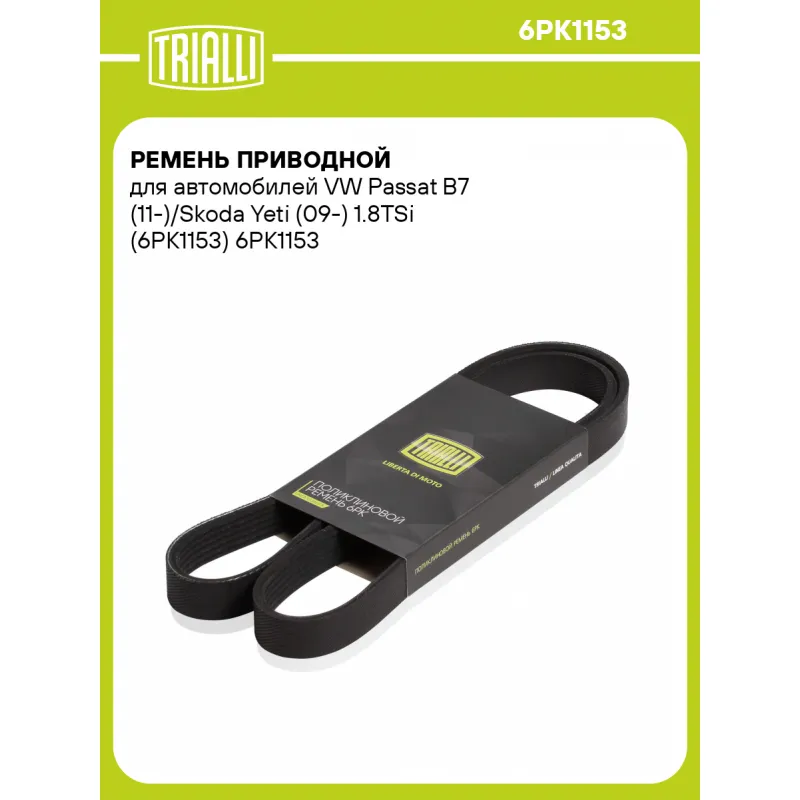 Ремень приводной для автомобилей VW Passat B7 (11-)/Skoda Yeti (09-) 1.8TSi (6PK1153) Характеристики: Артикул: 6PK1153 OEM номера: 11 28 8 581 682, 11 28 8 613 707, 11 28 8 650 740, 11 28 8 580 361, 5750E9, 5750C9, 5750J6, 5750.PC, 5750GX, 5750L4, 5750WJ, 5750FP, 5750L3, 16 138 400 80, 9623436980, 9623684780, 71749458, 1135719, 1097331, 95VW6C301CB, 95VW6C301BA, 95VW6C301AB, 95VW6C301AC, A0019938896, 19938896, 0019938896, MB879764, MD813600, 11720JD00B, 11720JD00C, 8200023912, 4506189, 9198522, 96403794, 96527469, 96527470, 9652746980, 9652747080, 9640379480, 7700864813, 8933001828, 37260849, 49180-65G20, 9091602730, 90916-02778, 90916-02735, 90916-02776, 3411617, 3473195, 3485927, 11 72 075 20R, 278923116302, 028260849J, 028260849N, 037260849A, 037260849C, 036145933AC, 3100141, 3805088 Количество на автомобиль: 1 Длина, мм.: 1153 Количество ребер: 6 Материал: EPDM Товарная линейка: BLACK Комплектация: Ремень поликлиновой - 1 шт Гарантия: от 1 года.