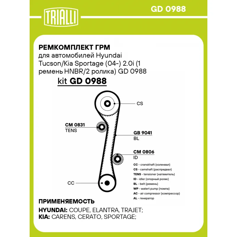 Ремкомплект ГРМ для автомобилей Hyundai Tucson/Kia Sportage (04-) 2.0i (1 ремень HNBR/2 ролика) Характеристики: Артикул: GD 0988 OEM номера: 2481023011, 2431223201, 2431223202, 2431223400, 2441023011, 2481023050, 2481023400, 2481023500, 2441023400, 2441023500 Гарантийный срок: 2 года/60 000 км. Ширина ремня ГРМ, мм.: 25,4 Количе... Читать полностью →
