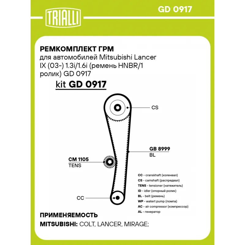 Ремкомплект ГРМ для автомобилей Mitsubishi Lancer IX (03-) 1.3i/1.6i (ремень HNBR/1 ролик) GD 0917 TRIALLI