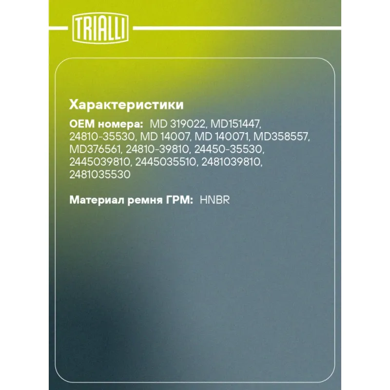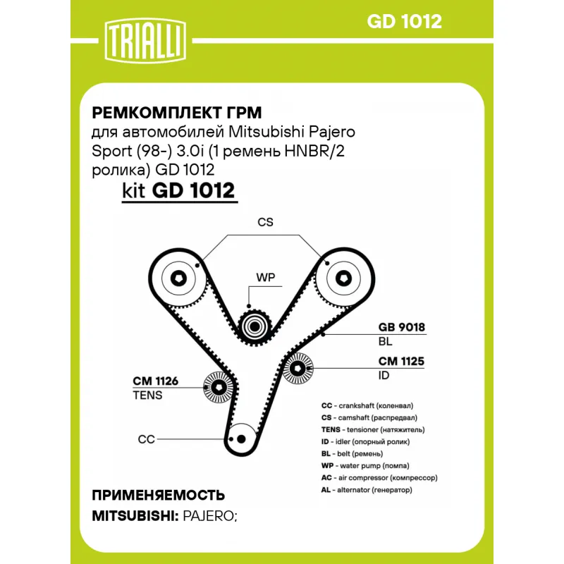 Ремкомплект ГРМ для автомобилей Mitsubishi Pajero Sport (98-) 3.0i (1 ремень HNBR/2 ролика) Характеристики: Артикул: GD 1012 OEM номера: MD 319022, MD151447, 24810-35530, MD 14007, MD 140071, MD358557, MD376561, 24810-39810, 24450-35530, 2445039810, 2445035510, 2481039810, 2481035530, 2481035510, 2481035500, 2445035530 Гарантийный срок: 2 года/60 000 км. Ширина ремня ГРМ, мм.: 32 Количество зубьев ремня ГРМ: 193 Материал ремня ГРМ: HNBR Товарная линейка: BLACK Комплектация: Ремень ГРМ - 1 шт Ролик ГРМ - 2 шт Гарантия: от 1 года.