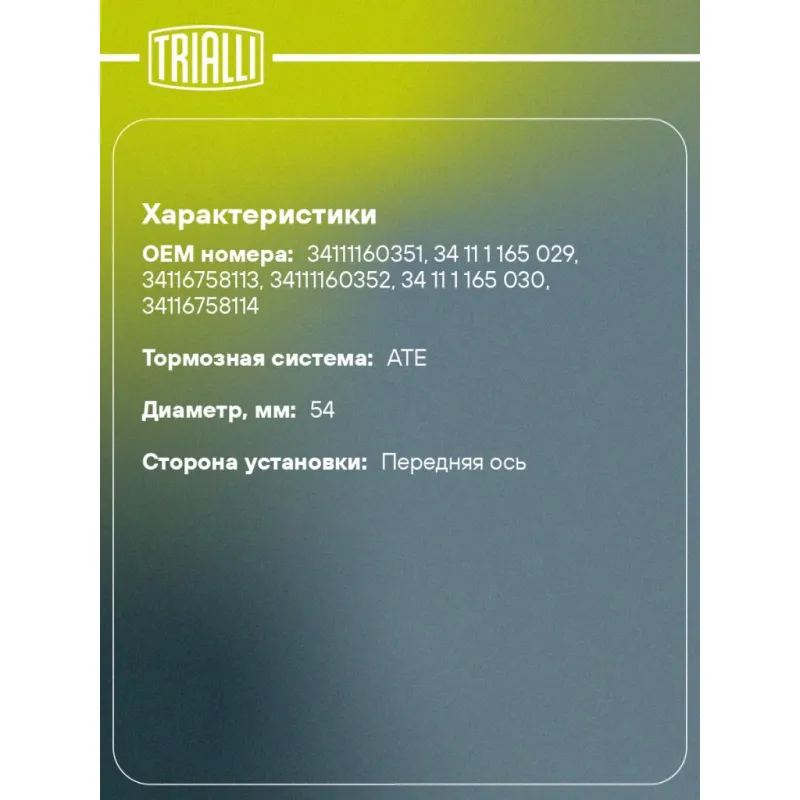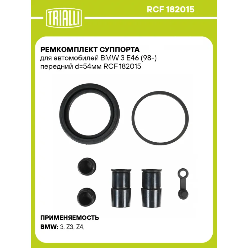 Ремкомплект суппорта для автомобилей BMW 3 E46 (98-) передний d=54мм Характеристики: Артикул: RCF 182015 OEM номера: 34111160351, 34 11 1 165 029, 34116758113, 34111160352, 34 11 1 165 030, 34116758114 Тормозная система: ATE Диаметр, мм: 54 Сторона установки: Передняя ось Количество на автомобиль: 2 Сопутствующие товары:: CF 182015, RCF 182016, CF 182016 Товарная линейка: BLACK Гарантийный срок: 2 года / 60 000 км Комплектация: Пыльник поршня (резина) - 1 шт Уплотнительное кольцо поршня (резина) - 1 шт Втулка направляющей (резина) - 2 шт Заглушка втулки направляющей (пластик) - 2 шт Заглушка/колпачок прокачного штуцера (резина) - 1 шт Гарантия: от 1 года.