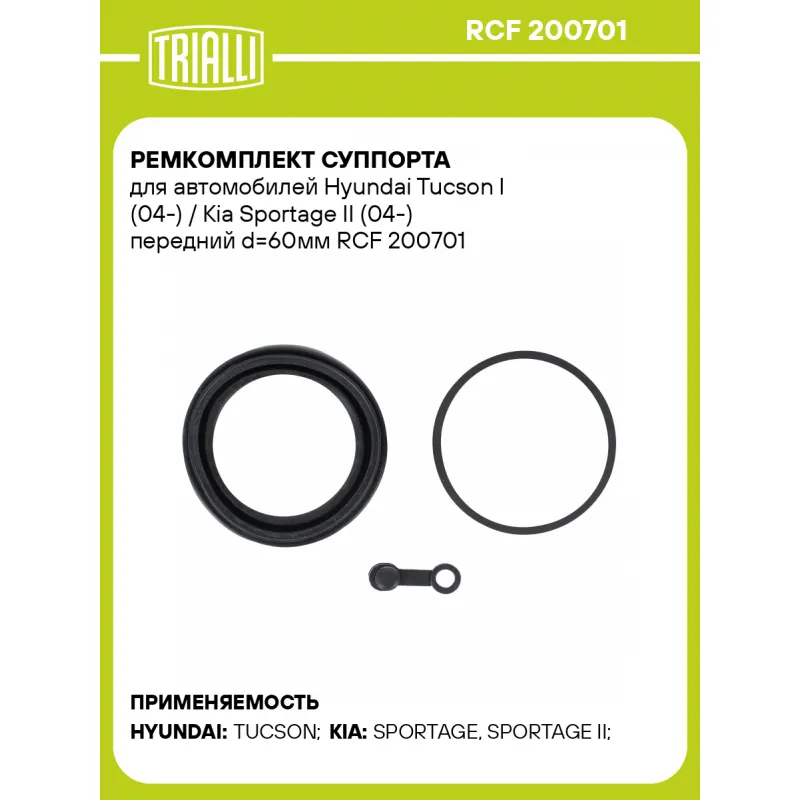 Ремкомплект суппорта для автомобилей Hyundai Tucson I (04-) / Kia Sportage II (04-) передний d=60мм Характеристики: Артикул: RCF 200701 OEM номера: 58180-2EA00, 58180-2EA10, 58190-2EA00, 58190-2EA10, 58110 1F000, 58110 2E000, 58130 1F000, 58130 2E000 Сопутствующие товары:: CF 200701, CF 200702, CF 200703, RCF 200702 Тормозная система: MANDO Диаметр, мм: 60 Гарантийный срок: 2 года / 60 000 км Сторона установки: Передняя ось Количество на автомобиль: 2 Товарная линейка: BLACK Комплектация: Уплотнительное кольцо поршня (резина) - 1 шт Пыльник поршня (резина) - 1 шт Заглушка/колпачок прокачного штуцера (резина) - 1 шт Гарантия: от 1 года.