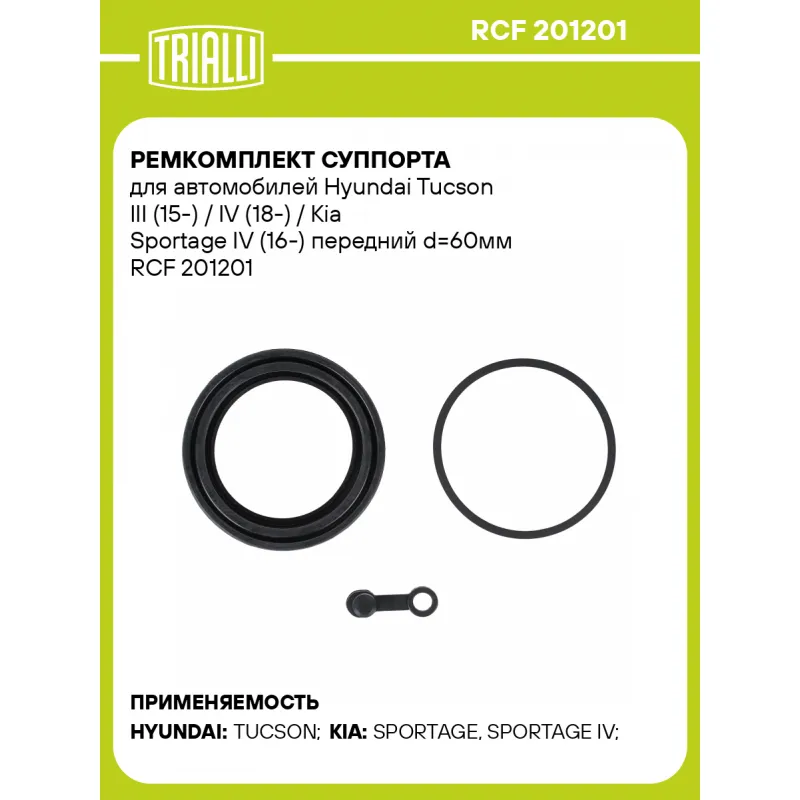 Ремкомплект суппорта для автомобилей Hyundai Tucson III (15-) / IV (18-) / Kia Sportage IV (16-) передний d=60мм Характеристики: Артикул: RCF 201201 OEM номера: 58110 D7500, 58180 D7A50, 58110-D7000, 58180-D7A00, 58130 D7500, 58190 D7A50, 58130-D7000, 58190-D7A00 Сопутствующие товары:: CF 201201, CF 201202, CF 201203, RCF 201202 Тормозная система: MOBIS Диаметр, мм: 60 Гарантийный срок: 2 года / 60 000 км Сторона установки: Передняя ось Количество на автомобиль: 2 Товарная линейка: BLACK Комплектация: Уплотнительное кольцо поршня (резина) - 1 шт Пыльник поршня (резина) - 1 шт Заглушка/колпачок прокачного штуцера (резина) - 1 шт Гарантия: от 1 года.