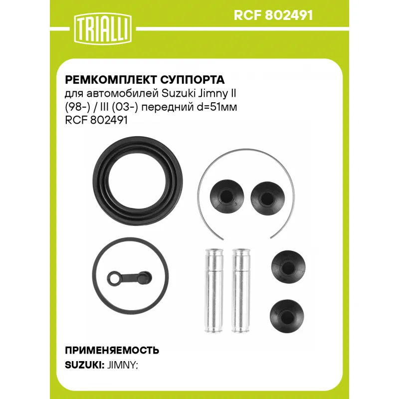 Ремкомплект суппорта для автомобилей Suzuki Jimny II (98-) / III (03-) передний d=51мм Характеристики: Артикул: RCF 802491 OEM номера: 55100 81A 10, 55100 81A 11, 55100 81A 12 Сопутствующие товары:: CF 000097, RCF 000098, CF 000096 Тормозная система: AISIN Диаметр, мм: 51 Гарантийный срок: 2 года / 60 000 км Сторона установки: П... Читать полностью →