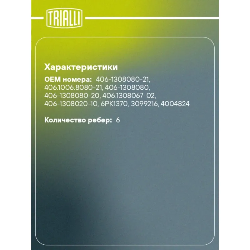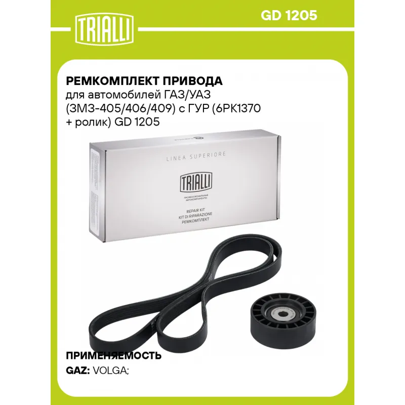 Ремкомплект привода для автомобилей ГАЗ/УАЗ (ЗМЗ-405/406/409) с ГУР (6PK1370 + ролик) Характеристики: Артикул: GD 1205 OEM номера: 406-1308080-21, 406.1006.8080-21, 406-1308080, 406-1308080-20, 406.1308067-02, 406-1308020-10, 6PK1370, 3099216, 4004824 Количество ребер: 6 Длина ремня, мм.: 1370 Количество ремней в комплекте: 1 Количество роликов: 1 Гарантийный срок: 2 года/60 000 км. Товарная линейка: BLACK Количество на автомобиль: 1 Комплектация: Ремень поликлиновой - 1 шт Ролик приводного ремня - 1 шт Гарантия: от 1 года.