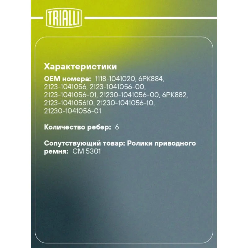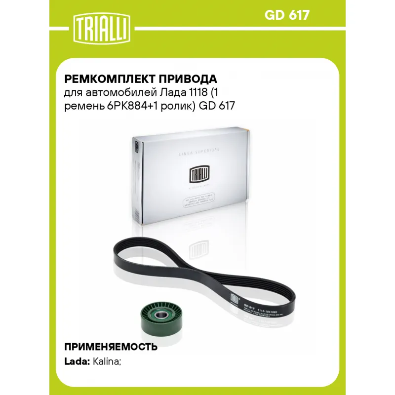 Ремкомплект привода для автомобилей Лада 1118 (1 ремень 6PK884+1 ролик) Характеристики: Артикул: GD 617 OEM номера: 1118-1041020, 6PK884, 2123-1041056, 2123-1041056-00, 2123-1041056-01, 21230-1041056-00, 6PK882, 2123-104105610, 21230-1041056-10, 21230-1041056-01, 21230104106510, 1118-3701720, 11180-1041020-00, 11180-3701720-00 Количество ребер: 6 Длина ремня, мм.: 884 Количество ремней в комплекте: 1 Количество роликов: 1 Товарная линейка: BLACK Количество на автомобиль: 1 Сопутствующие товары:: CM 123, GD 618, GD 612, GD 618 Особенности конструкции:: ремкомплект Гарантийный срок: 2 года/60 000 км. Сопутствующий товар: Ролики приводного ремня: CM 5301 Подходит для авто: ВАЗ Kalina (04-) Для проверки применяемости отправьте VIN автомобиля через вкладку "Есть вопросы о товаре?" Комплектация: Ремень поликлиновой - 1 шт Ролик приводного ремня - 1 шт Гарантия: от 1 года.