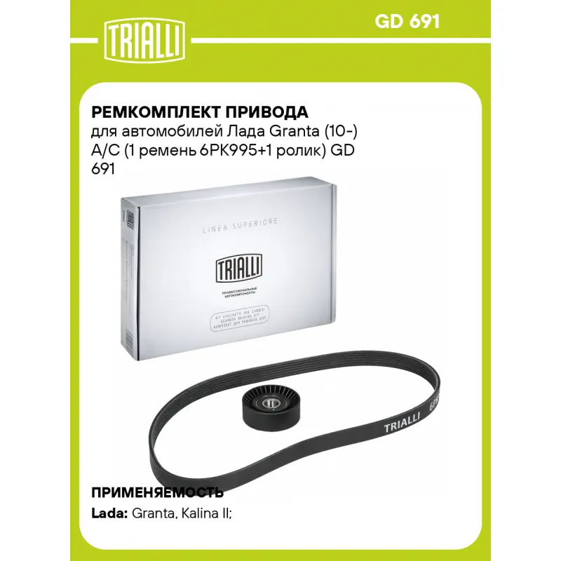 Ремкомплект привода для автомобилей Лада Granta (10-) A/C (1 ремень 6PK995+1 ролик) Характеристики: Артикул: GD 691 OEM номера: 2123-1041056, 2123-1041056-00, 2123-1041056-01, 21230-1041056-00, 21230-1041056-01, 21230-1041056-10, 6PK995, 2190-1041020-00, 21900-1041020-00, 2190-1041020, 2123-104105610 Количество ребер: 6 Длина ремня, мм.: 995 Количество ремней в комплекте: 1 Количество роликов: 1 Гарантийный срок: 2 года/60 000 км. Товарная линейка: BLACK Количество на автомобиль: 1 Сопутствующие товары:: GD 612, GD 623, GD, 617, GD 618, GD 613, GD 690, GD 624 Особенности конструкции:: для автомобилей с кондиционером A/C Сопутствующий товар: Ролики приводного ремня: CM 0118; CM 1022; CM 123; CM 5093; CM 5123; CM 5154; CM 5156 Подходит для авто: ВАЗ Granta (10-), Kalina II (13-) Для проверки применяемости отправьте VIN автомобиля через вкладку "Есть вопросы о товаре?" Комплектация: Ролик генератора - 1 шт Ремень генератора - 1 шт Гарантия: от 1 года.
