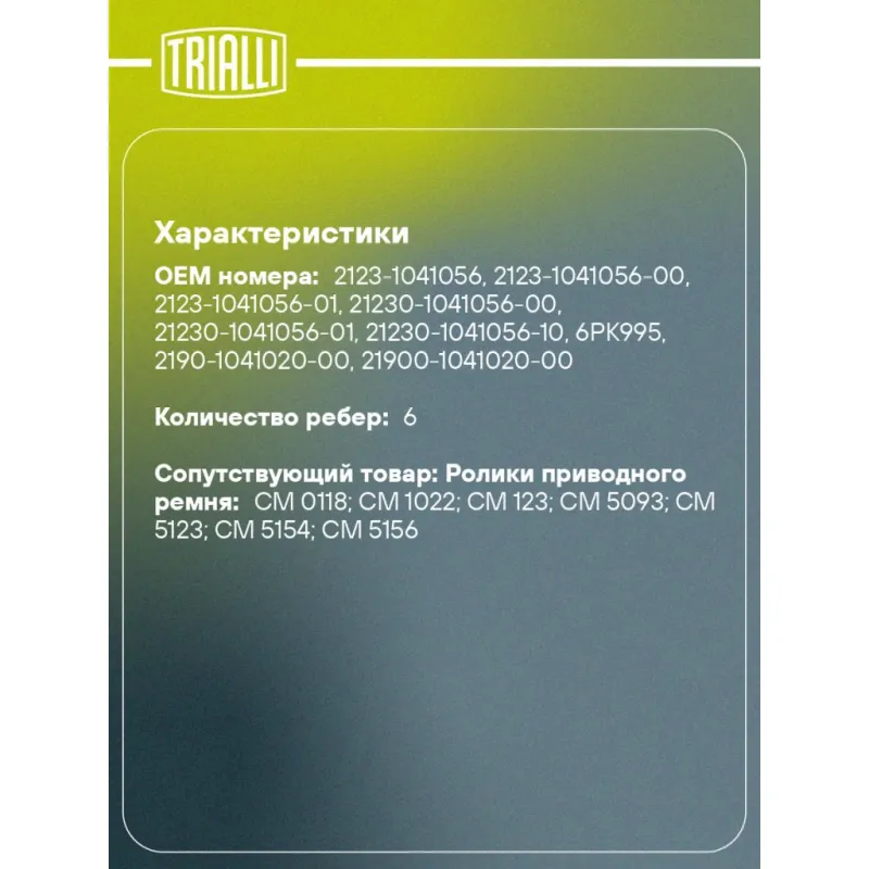 | Сопутствующий товар: Ролики приводного ремня | CM 0118; CM 1022; CM 123; CM 5093; CM 5123; CM 5154; CM 5156 |