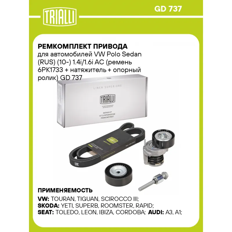 Ремкомплект привода для автомобилей VW Polo Sedan (RUS) (10-) 1.4i/1.6i AC (ремень 6PK1733 + натяжитель + опорный ролик) GD 737 TRIALLI