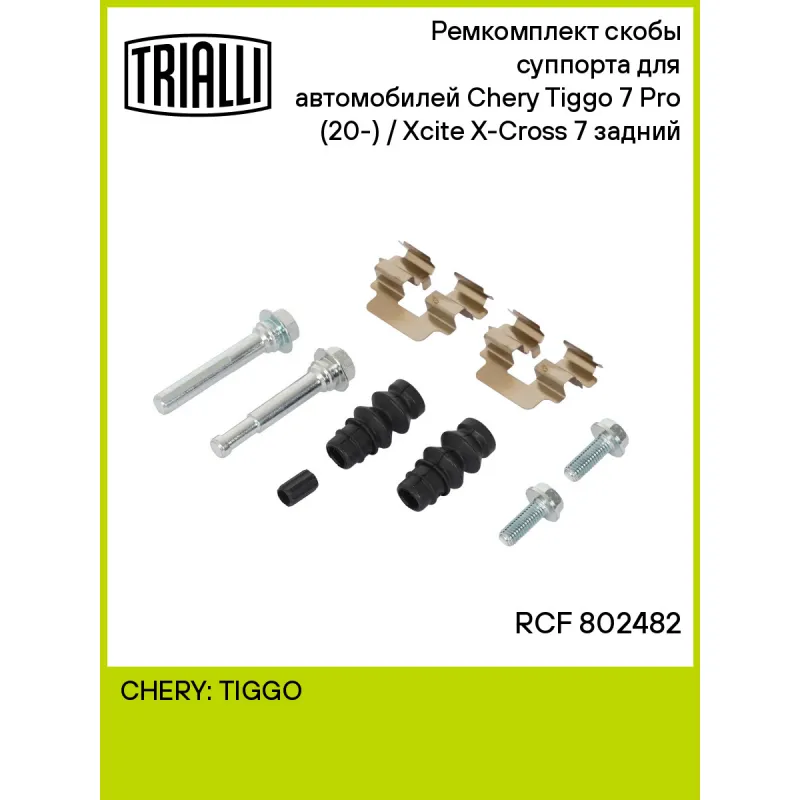 Ремкомплект скобы суппорта для автомобилей Chery Tiggo 7 Pro (20-) / Xcite X-Cross 7 (24-) задний Характеристики: Артикул: RCF 802482 OEM номера: 204000473AA, 204000473AA3502ACB, 204000474AA, 204000474AA3502ACB Сопутствующие товары:: CF 800184, CF 800185, CF 800186, RCF 800185, RCM 800185 Особенности конструкции:: автомобиль с электродвигателем стояночного тормоза Диаметр, мм: 38 Гарантийный срок: 2 года / 60 000 км Сторона установки: Задняя ось Количество на автомобиль: 2 Комплектация: Направляющая (сталь) - 2 шт Крепёжный винт (сталь) - 2 шт Пыльник направляющей (резина) - 2 шт Уплотнение направляющей суппорта (резина) - 1 шт Направляющая пружина колодок (сталь) - 2 шт Гарантия: от 1 года.