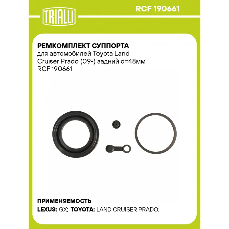 Ремкомплект суппорта для автомобилей Toyota Land Cruiser Prado (09-) задний d=48мм Характеристики: Артикул: RCF 190661 OEM номера: 47750-34030, 47730-34030 Тормозная система: SUMITOMO Диаметр, мм: 48 Сторона установки: Задняя ось Количество на автомобиль: 2 Сопутствующие товары:: CF 190661, CF 190662, RCF 190662 Товарная линейка... Читать полностью →