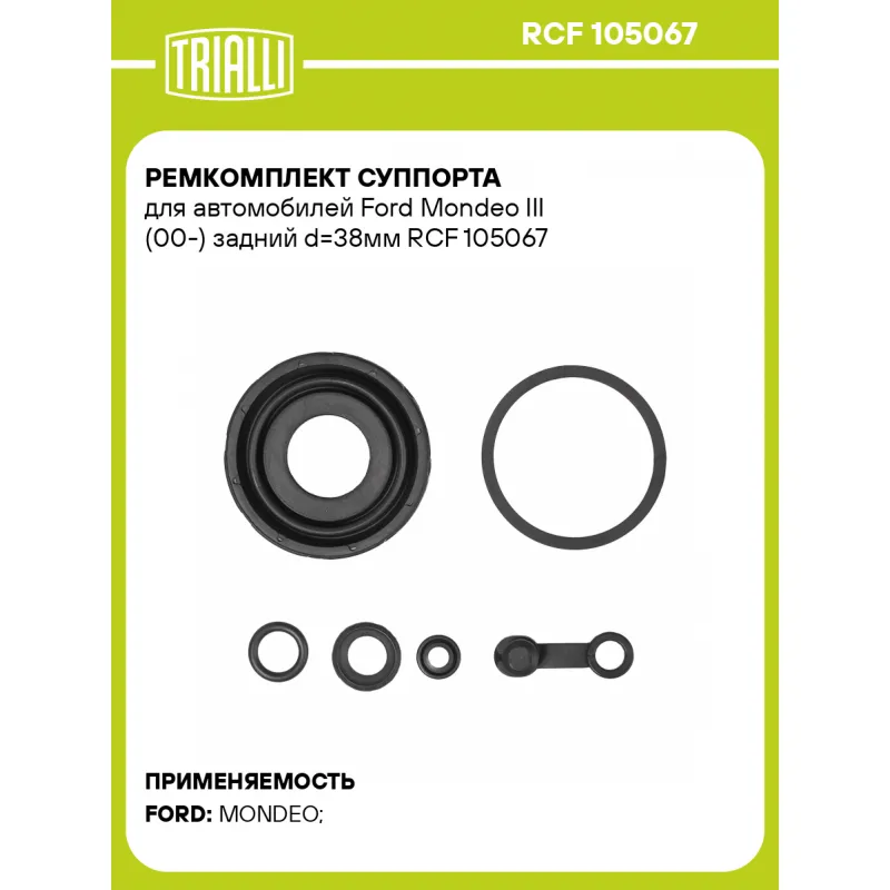 Ремкомплект суппорта для автомобилей Ford Mondeo III (00-) задний d=38мм Характеристики: Артикул: RCF 105067 OEM номера: 1356387, 1504907, 4S71-2553-AA, 4S71-2553-AB, 2041803, RM4S712553AB, 1356388, 1504906, 4S71-2552-AA, 4S71-2552-AB, 2041798, RM4S712552AB Сопутствующие товары:: CF 105067, CF 105068, CF 032193, RCF 105068 Тормозная система: BOSCH Диаметр, мм: 38 Гарантийный срок: 2 года / 60 000 км Сторона установки: Задняя ось Количество на автомобиль: 2 Товарная линейка: BLACK Комплектация: Уплотнительное кольцо поршня (резина) - 1 шт Уплотнительное кольцо (резина) - 2 шт Заглушка/колпачок прокачного штуцера (резина) - 1 шт Сальник (манжета) привода ручного тормоза (резина) - 1 шт Пыльник поршня (резина) - 1 шт Гарантия: от 1 года.