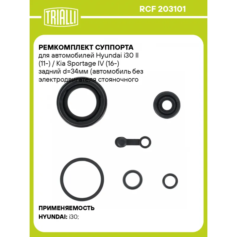 Ремкомплект суппорта для автомобилей Hyundai i30 II (11-) / Kia Sportage IV (16-) задний d=34мм (автомобиль без электродвигателя стояночного тормоза) Характеристики: Артикул: RCF 203101 OEM номера: 58300 A6300, 58310 A6A30, 58300 A6310, 58300 A6330, 58310 A6A31, 58310 A6A33, 58311 A6A30, 58400 A6300, 58400 A6310, 58311 A6A31, 58311 A6A33, 58400 A6330, 58210D3000 Сопутствующие товары:: CF 203101, CF 203102, CF 203103, RCF 203102 Особенности конструкции:: Для автомобилей без электрического стояночного тормоза Тормозная система: MOBIS Диаметр, мм: 34 Гарантийный срок: 2 года / 60 000 км Сторона установки: Задняя ось Количество на автомобиль: 2 Товарная линейка: BLACK Комплектация: Уплотнительное кольцо поршня (резина) - 1 шт Пыльник поршня (резина) - 1 шт Уплотнительное кольцо (резина) - 2 шт Сальник (манжета) привода ручного тормоза (резина) - 1 шт Заглушка/колпачок прокачного штуцера (резина) - 1 шт Гарантия: от 1 года.