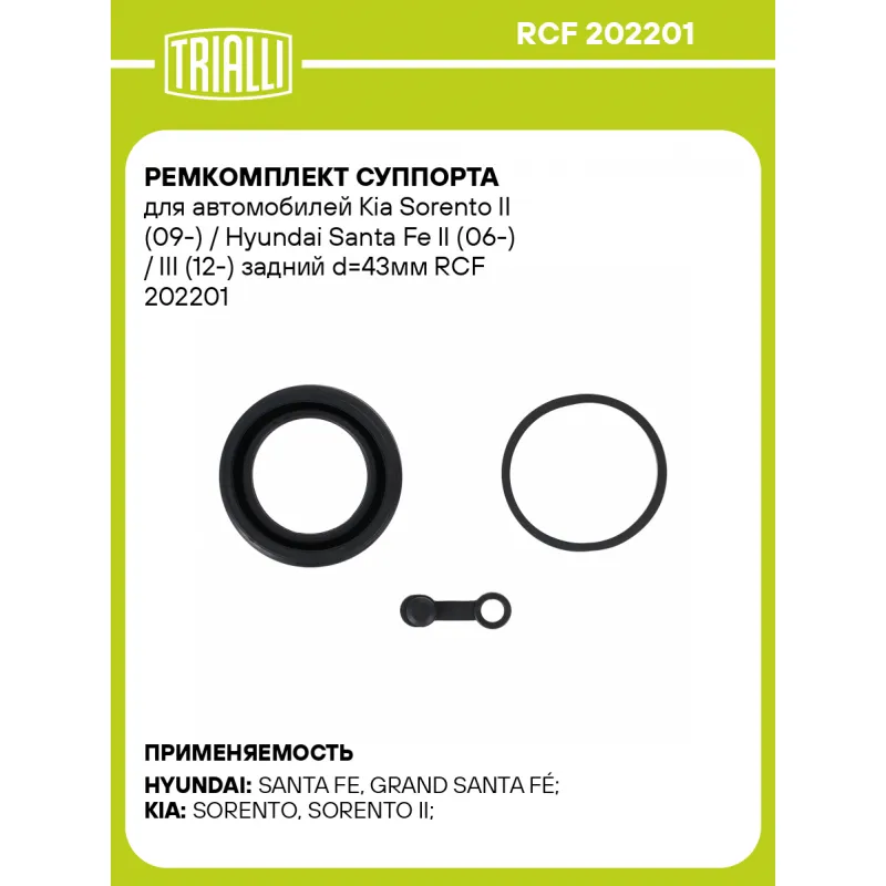 Ремкомплект суппорта для автомобилей Kia Sorento II (09-) / Hyundai Santa Fe II (06-) / III (12-) задний d=43мм Характеристики: Артикул: RCF 202201 OEM номера: 58210 2P700, 58310 2BA20, 58310 2PA70, 58310 2WA00, 58230 2P700, 58311 2BA20, 58311 2PA70, 58311 2WA00 Сопутствующие товары:: CF 202201, CF 202202, CF 202203, RCF 202202 Тормозная система: MANDO Диаметр, мм: 43 Гарантийный срок: 2 года / 60 000 км Сторона установки: Задняя ось Количество на автомобиль: 2 Товарная линейка: BLACK Комплектация: Уплотнительное кольцо поршня (резина) - 1 шт Пыльник поршня (резина) - 1 шт Заглушка/колпачок прокачного штуцера (резина) - 1 шт Гарантия: от 1 года.