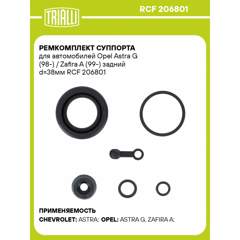 Ремкомплект суппорта для автомобилей Opel Astra G (98-) / Zafira A (99-) задний d=38мм Характеристики: Артикул: RCF 206801 OEM номера: 16 05 116, 0542294, 93176623, 9193980, 09192152, 5 42 308, 5 42 309, 93171072, 09192153, 0542295, 12 16 972, 9196456, 5 42 300, 93171071, 9193981, 9196457, 5 42 301 Сопутствующие товары:: CF 206801, CF 206802, CF 206803, RCF 206802 Тормозная система: BOSCH/BENDIX Диаметр, мм: 38 Гарантийный срок: 2 года / 60 000 км Сторона установки: Задняя ось Количество на автомобиль: 2 Товарная линейка: BLACK Комплектация: Уплотнительное кольцо поршня (резина) - 1 шт Пыльник поршня (резина) - 1 шт Уплотнительное кольцо (резина) - 2 шт Сальник (манжета) привода ручного тормоза (резина) - 1 шт Заглушка/колпачок прокачного штуцера (резина) - 1 шт Гарантия: от 1 года.