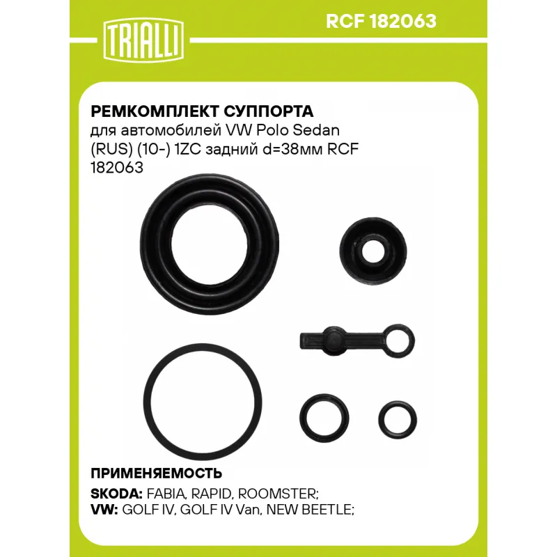 Ремкомплект суппорта для автомобилей VW Polo Sedan (RUS) (10-) 1ZC задний d=38мм Характеристики: Артикул: RCF 182063 OEM номера: 6R0 615 423, 6R0 615 423 A, 6R0 615 424, 6R0 615 424 A, 1J0615423D, 1J0615423G, 8N0615423D, 6Y0615423, 1J0615424D, 1J0615424F, 1J0615424H, 8N0615424D, 6Y0615424, 1J0 615 423 F, 1J0 615 424 G Тормозная система: LUCAS/TRW Диаметр, мм: 38 Сторона установки: Задняя ось Количество на автомобиль: 2 Товарная линейка: BLACK Гарантийный срок: 2 года / 60 000 км Комплектация: Уплотнительное кольцо поршня (резина) - 1 шт Пыльник поршня (резина) - 1 шт Заглушка/колпачок прокачного штуцера (резина) - 1 шт Уплотнительное кольцо (резина) - 2 шт Сальник (манжета) привода ручного тормоза (резина) - 1 шт Гарантия: от 1 года.
