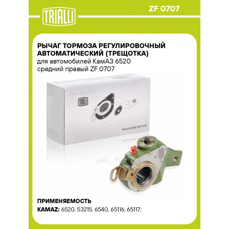 Рычаг тормоза регулировочный автоматический (трещотка) для автомобилей КамАЗ 6520 средний правый Характеристики: Артикул: ZF 0707 OEM номера: 79364, 45104-3501364-90, 45104 3502152-90 Сторона установки: Средняя ось справа Товарная линейка: BLACK Длина плеча 1, мм: 150 Диаметр отверстия фланца 1, мм: 12.7 Парный товар: ZF 0708 Количество на автомобиль: 1 Тип: Автоматический Параметры шлица: 10-31мм-38.4мм-5.9мм Гарантийный срок: 2 года / 60 000 км Подходит для авто: КамаАЗ 6520, 53215, 6540, 65116, 65117, 6520, 6520, 6520, 55111, 55111, 54115, 65115, 6540, 6540, 65116, 65116, 65117, 65117 Для проверки применяемости отправьте VIN автомобиля через вкладку "Есть вопросы о товаре?" Комплектация: Рычаг тормоза регулировочный - 1 шт Гарантия: от 1 года.