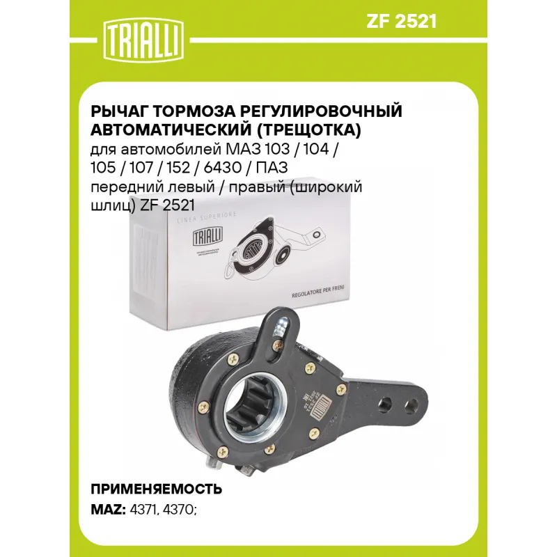Рычаг тормоза регулировочный автоматический (трещотка) для автомобилей МАЗ 103 / 104 / 105 / 107 / 152 / 6430 / ПАЗ передний левый / правый (широкий шлиц) Характеристики: Артикул: ZF 2521 OEM номера: 103-3501136 Особенности конструкции:: Широкий шлиц Гарантийный срок: 2 года / 60 000 км Сторона установки: Передняя ось Параметры шлица: 10-40.3мм-32.5мм-5.3мм Товарная линейка: BLACK Диаметр отверстия фланца 1, мм: 12 Диаметр отверстия фланца 2, мм: 12 Количество на автомобиль: 2 Тип: Автоматический Комплектация: Рычаг тормоза регулировочный - 1 шт Гарантия: от 1 года.