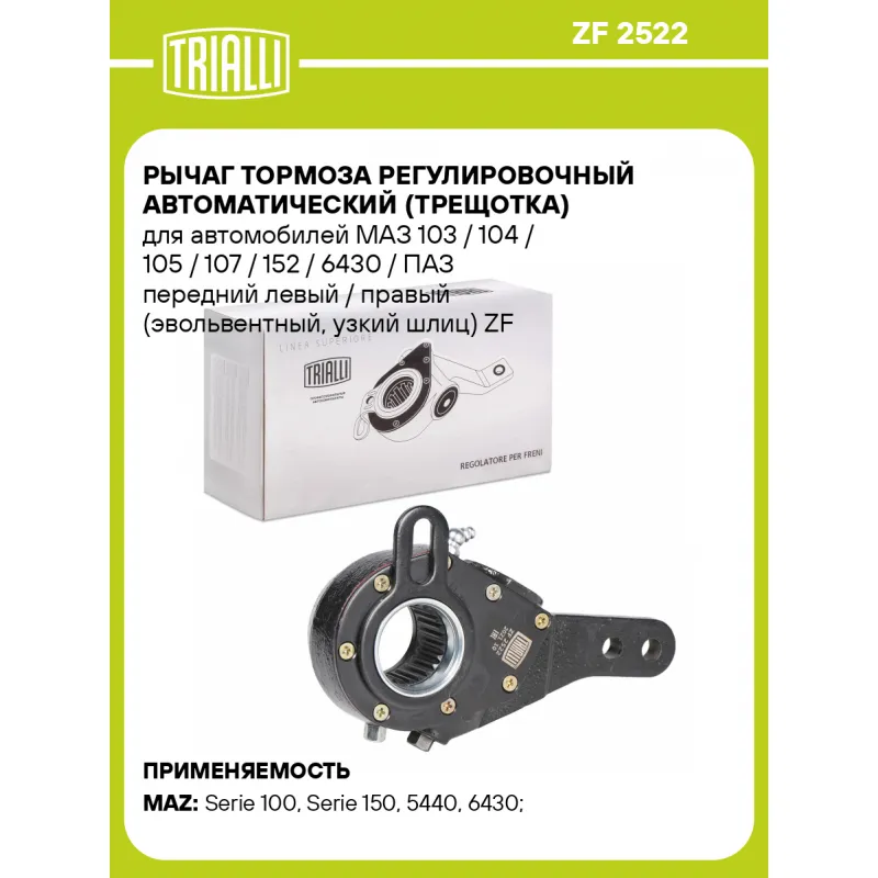 Рычаг тормоза регулировочный автоматический (трещотка) для автомобилей МАЗ 103 / 104 / 105 / 107 / 152 / 6430 / ПАЗ передний левый / правый (эвольвентный, узкий шлиц) Характеристики: Артикул: ZF 2522 OEM номера: 103-3501136-010 Особенности конструкции:: Эвольвентный, узкий шлиц Гарантийный срок: 2 года / 60 000 км Сторона установки: Передняя ось Параметры шлица: 25-40мм-37мм Товарная линейка: BLACK Диаметр отверстия фланца 1, мм: 12 Диаметр отверстия фланца 2, мм: 12 Количество на автомобиль: 2 Тип: Автоматический Комплектация: Рычаг тормоза регулировочный - 1 шт Гарантия: от 1 года.