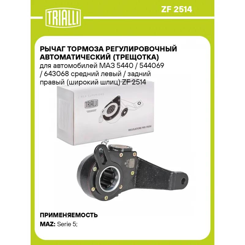 Рычаг тормоза регулировочный автоматический (трещотка) для автомобилей МАЗ 5440 / 544069 / 643068 средний левый / задний правый (широкий шлиц) Характеристики: Артикул: ZF 2514 OEM номера: 64226-3502135 Особенности конструкции:: Широкий шлиц Гарантийный срок: 2 года / 60 000 км Сторона установки: Средняя ось слева/задняя ось справа Параметры шлица: 10-40.3мм-32.5мм-5.3мм Товарная линейка: BLACK Длина плеча 1, мм: 150 Диаметр отверстия фланца 1, мм: 12 Количество на автомобиль: 2 Тип: Автоматический Комплектация: Рычаг тормоза регулировочный - 1 шт Гарантия: от 1 года.