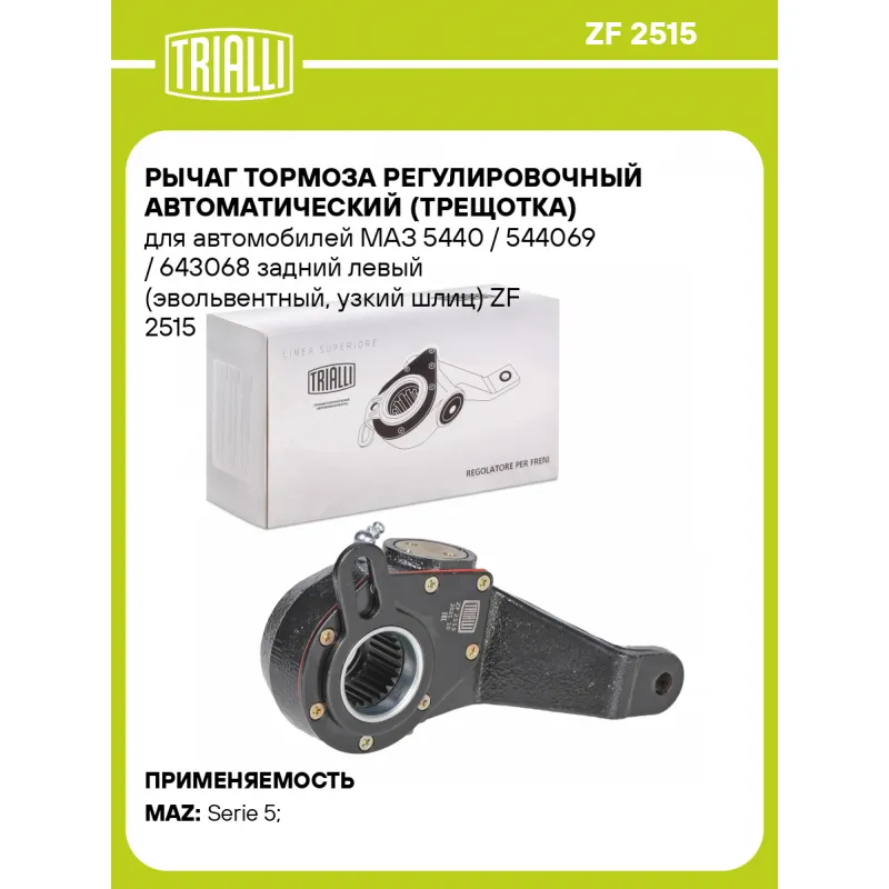 Рычаг тормоза регулировочный автоматический (трещотка) для автомобилей МАЗ 5440 / 544069 / 643068 задний левый (эвольвентный, узкий шлиц) Характеристики: Артикул: ZF 2515 OEM номера: 64226-3502135-010 Особенности конструкции:: Эвольвентный, узкий шлиц Гарантийный срок: 2 года / 60 000 км Сторона установки: Задняя ось слева Параметры шлица: 25-40мм-37мм Товарная линейка: BLACK Длина плеча 1, мм: 150 Диаметр отверстия фланца 1, мм: 12 Парный товар: ZF 2517 Количество на автомобиль: 1 Тип: Автоматический Комплектация: Рычаг тормоза регулировочный - 1 шт Гарантия: от 1 года.